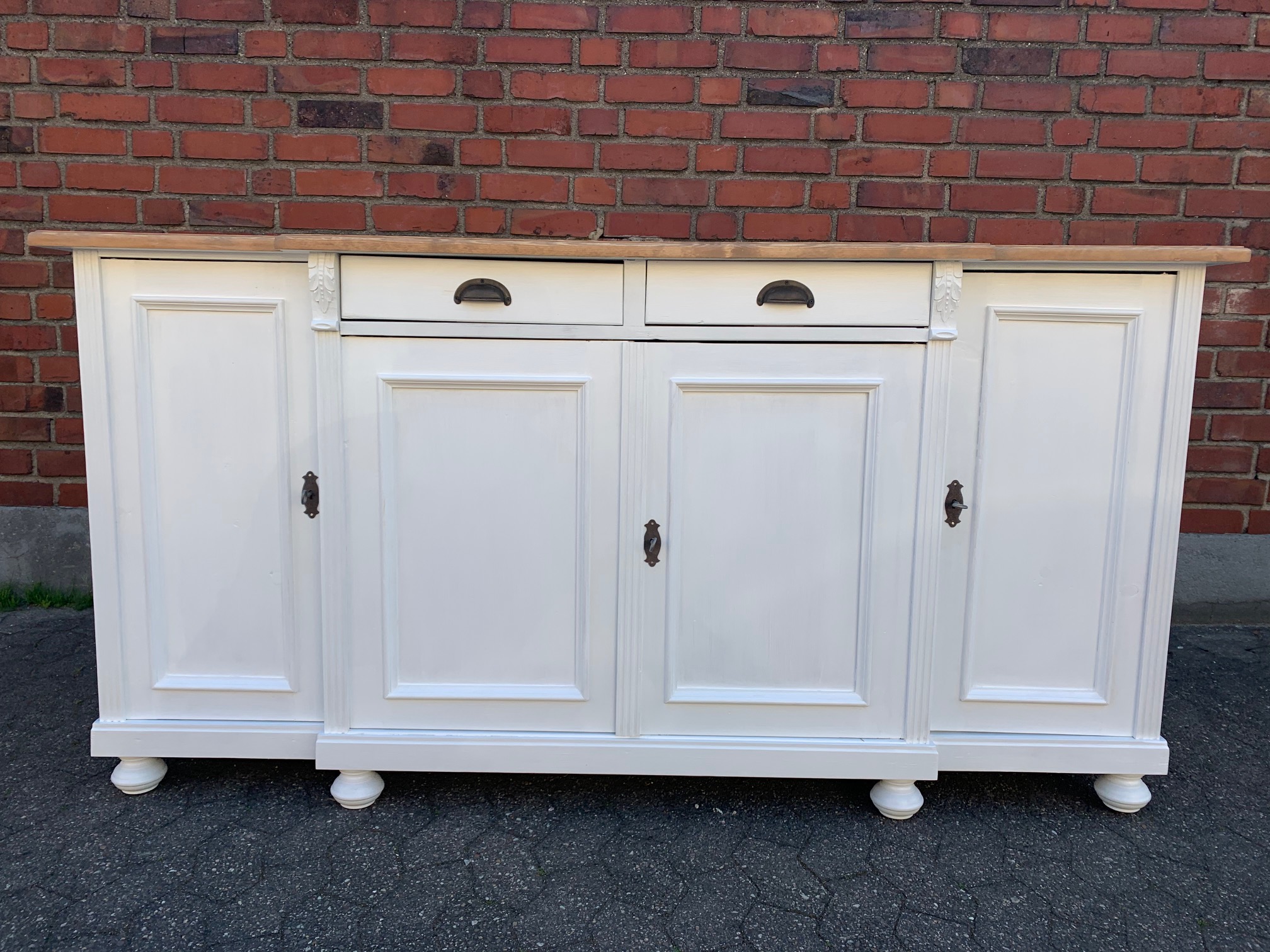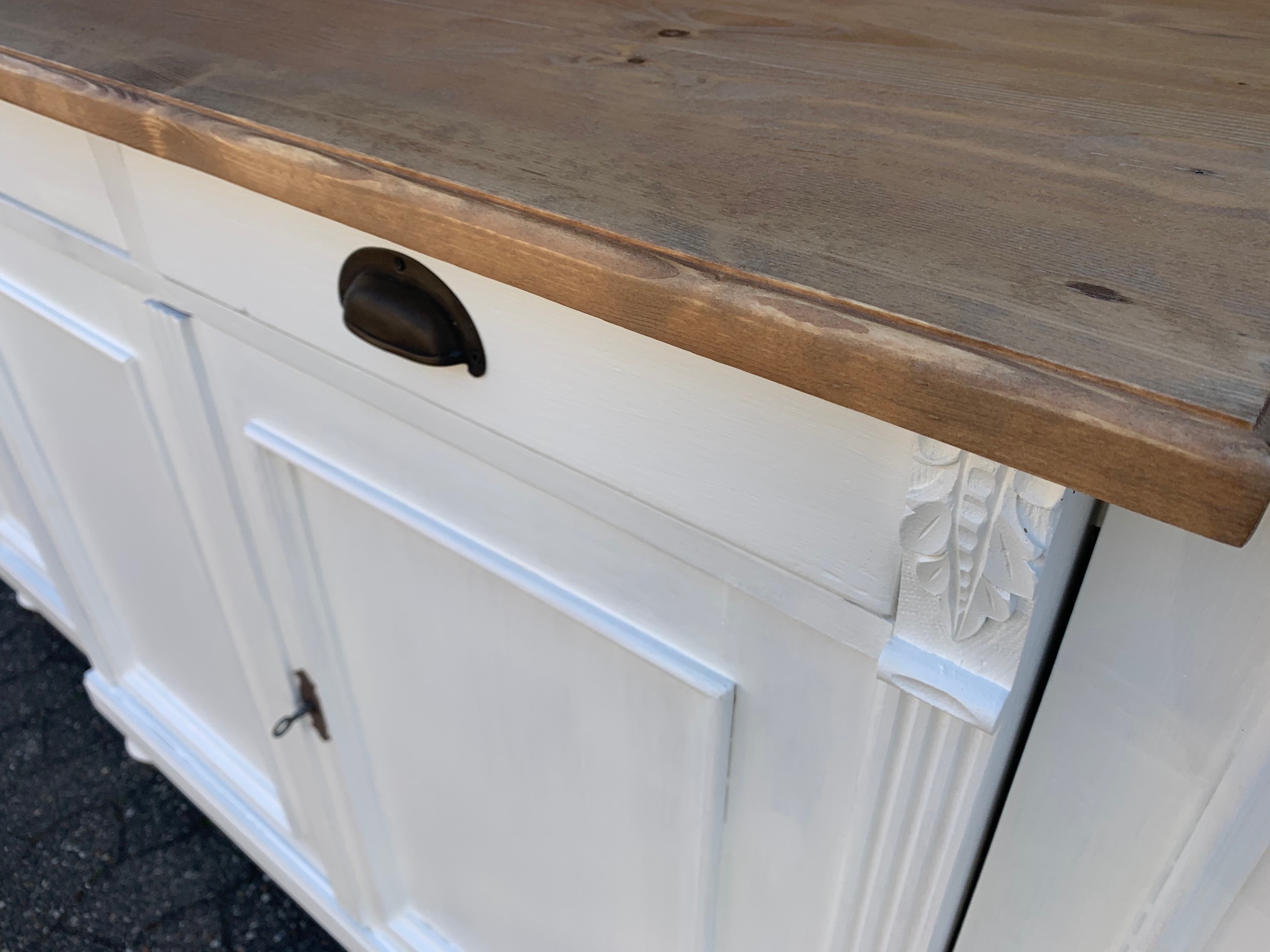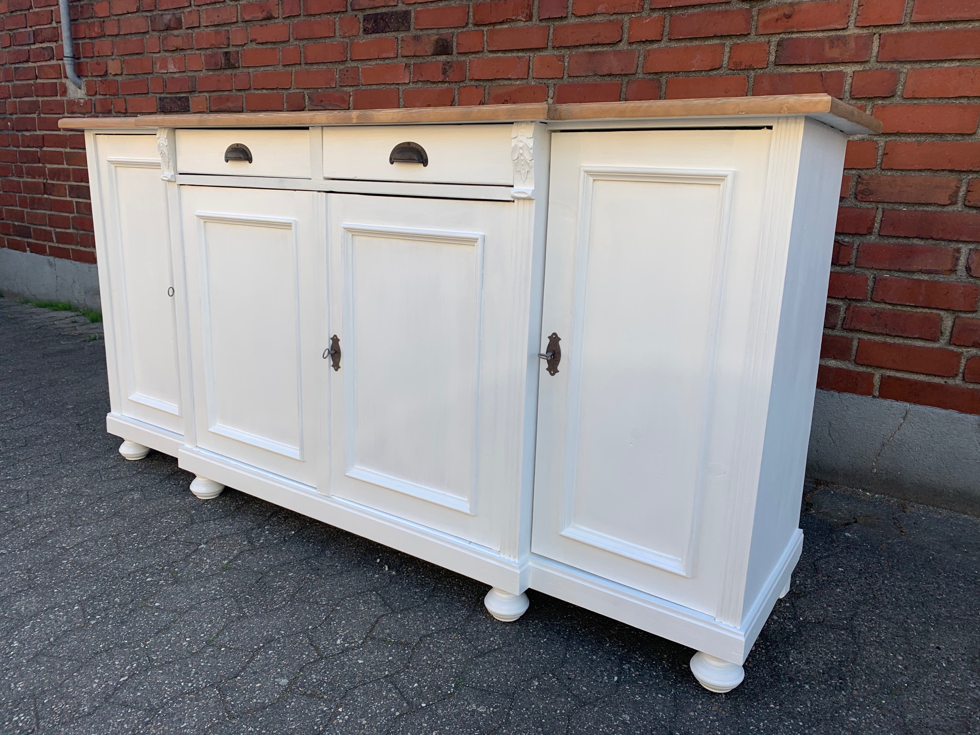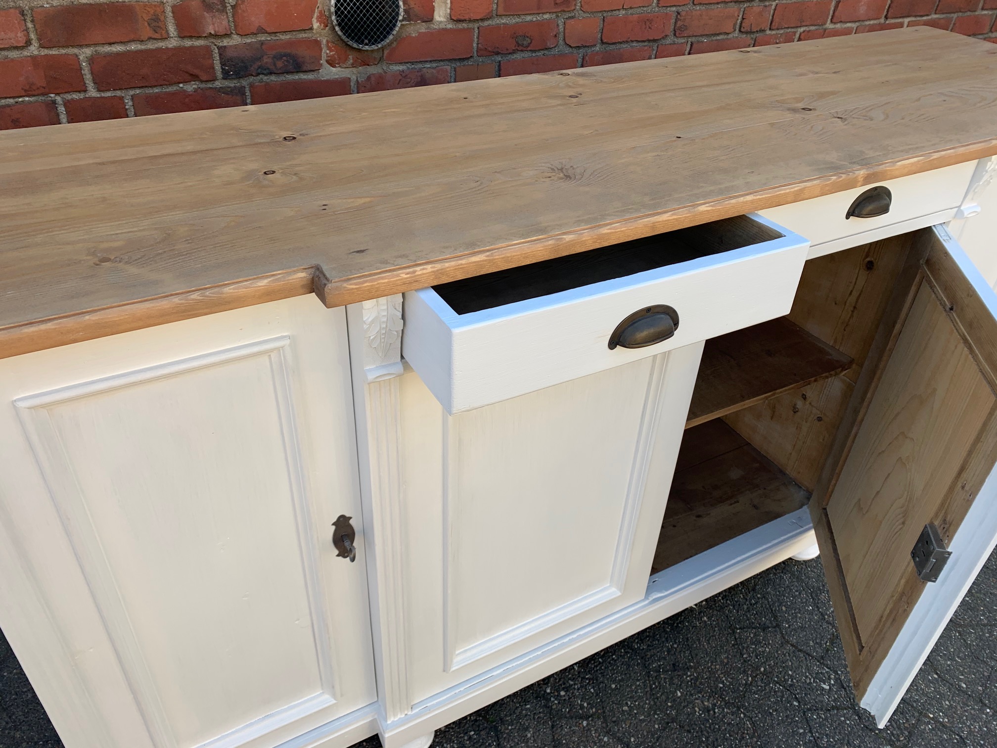Eine großes Sideboard im Landhaus Stil aus Weichholz mit einem weiß lackiertem Korpus und einer naturbelassenen, gewachsten Platte. Unsere erfahrenen Schreiner haben mit viel Liebe zum Detail diese schöne Anrichte fachgerecht neu gebaut. Die zwei Schubladen bieten viel Stauraum an. Innenseitig mit Regalböden ausgestattet. Die Lieferung erfolgt komplett montiert.