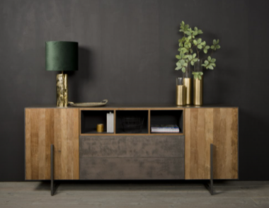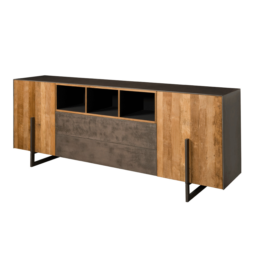 Das Sideboard Ora 222 cm ist ein modernes und zeitgemäßes Möbelstück aus recyceltem Teakholz. Das Sideboard hat ein modernes Design, mit einem Bein, das in den Griff übergeht, Der TV-Schrank hat zwei Türen, zwei Schubladen und drei offene Fächer.