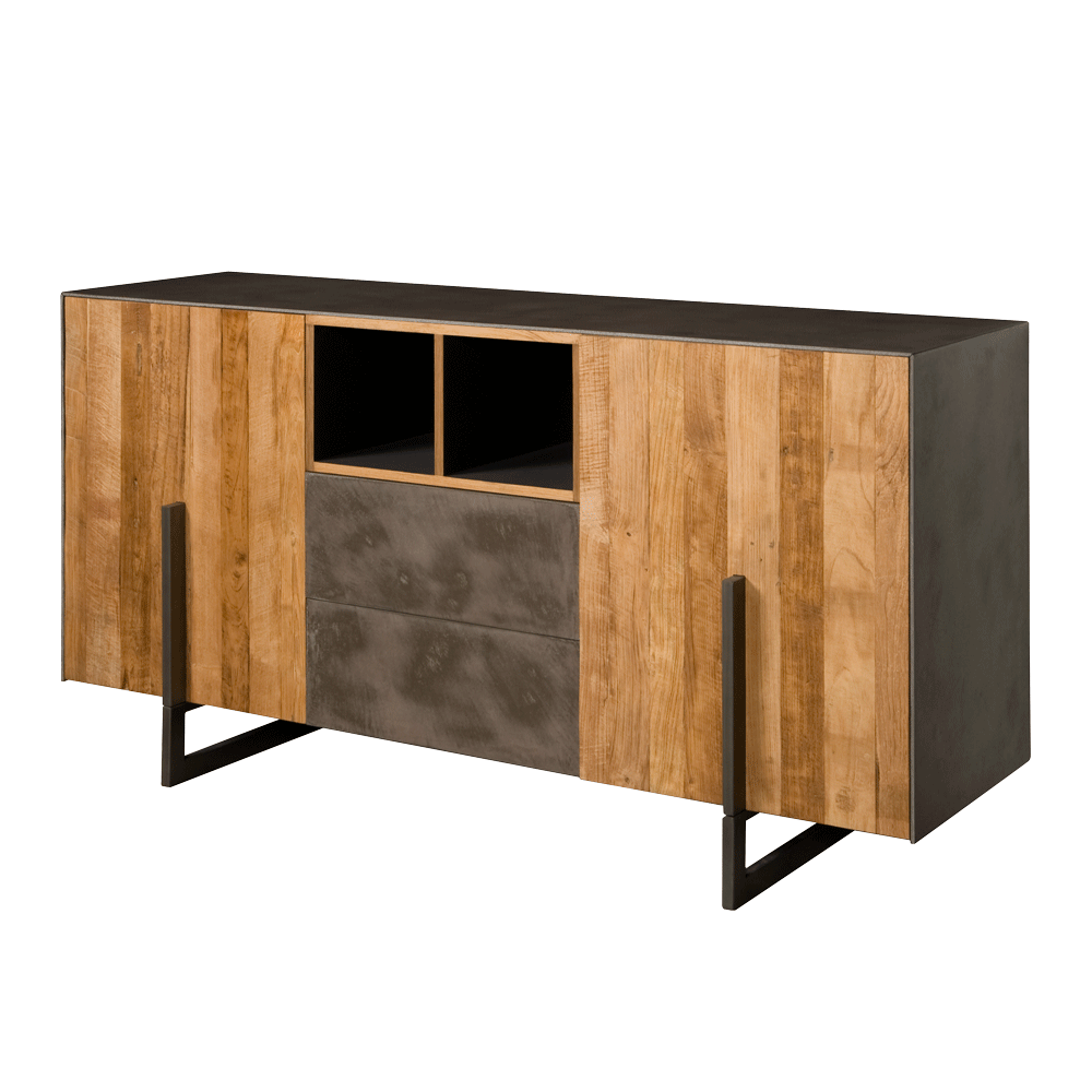 Das Sideboard Ora 167 cm ist ein modernes und zeitgemäßes Möbelstück aus recyceltem Teakholz. Das Sideboard hat ein modernes Design, mit einem Bein, das in den Griff übergeht, Der TV-Schrank hat zwei Türen, zwei Schubladen und zwei offene Fächer.
