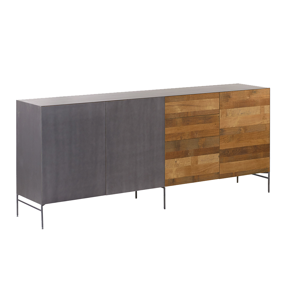 Pandora ist eine moderne und zeitgenössische Möbelserie, die aus gebürstetem und recyceltem Teakholz kombiniert mit Metall hergestellt wird. Die gradlinigen grifflosen Möbel stehen auf hohen, massiven Metallbeinen. Pandora spiegelt den momentanen Trend wider.