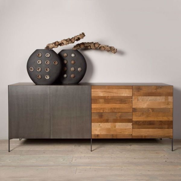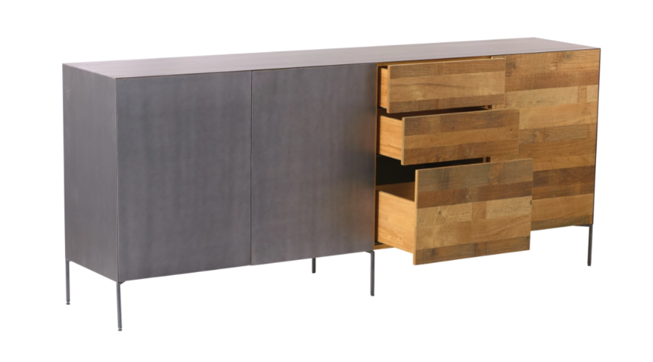 Das Sideboard Pandora 221 cm ist ein modernes und zeitgemäßes Möbelstück aus gebürstetem und recyceltem Teakholz in Kombination mit Metall. Dieses Möbelstück steht auf schlanken hohen Beinen aus massivem Metall. Das Sideboard hat drei Türen und drei Schubladen.
