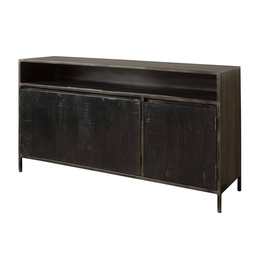 Das Sideboard Paterno 155 cm ist ein ist ein griffloses Industriemöbel, das sich perfekt in ein Mix & Match-Interieur einfügt. Das Sideboard Paterno besteht aus schwarz gebeiztem Mangoholz und Industriestahl. Das Sideboard Paterno hat ein offenes Fach und drei Türen.
