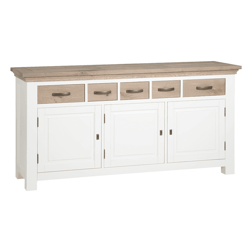 Das Sideboard Parma Toscana 180 cm ist aus rustikaler Eiche und Kiefer gefertigt. Die Eichenholzteile sind leicht gebürstet und mit einem Öl veredelt. Dieses Möbel hat drei Türen und fünf Schubladen, sehr praktisch, um alle möglichen Dinge zu verstauen.