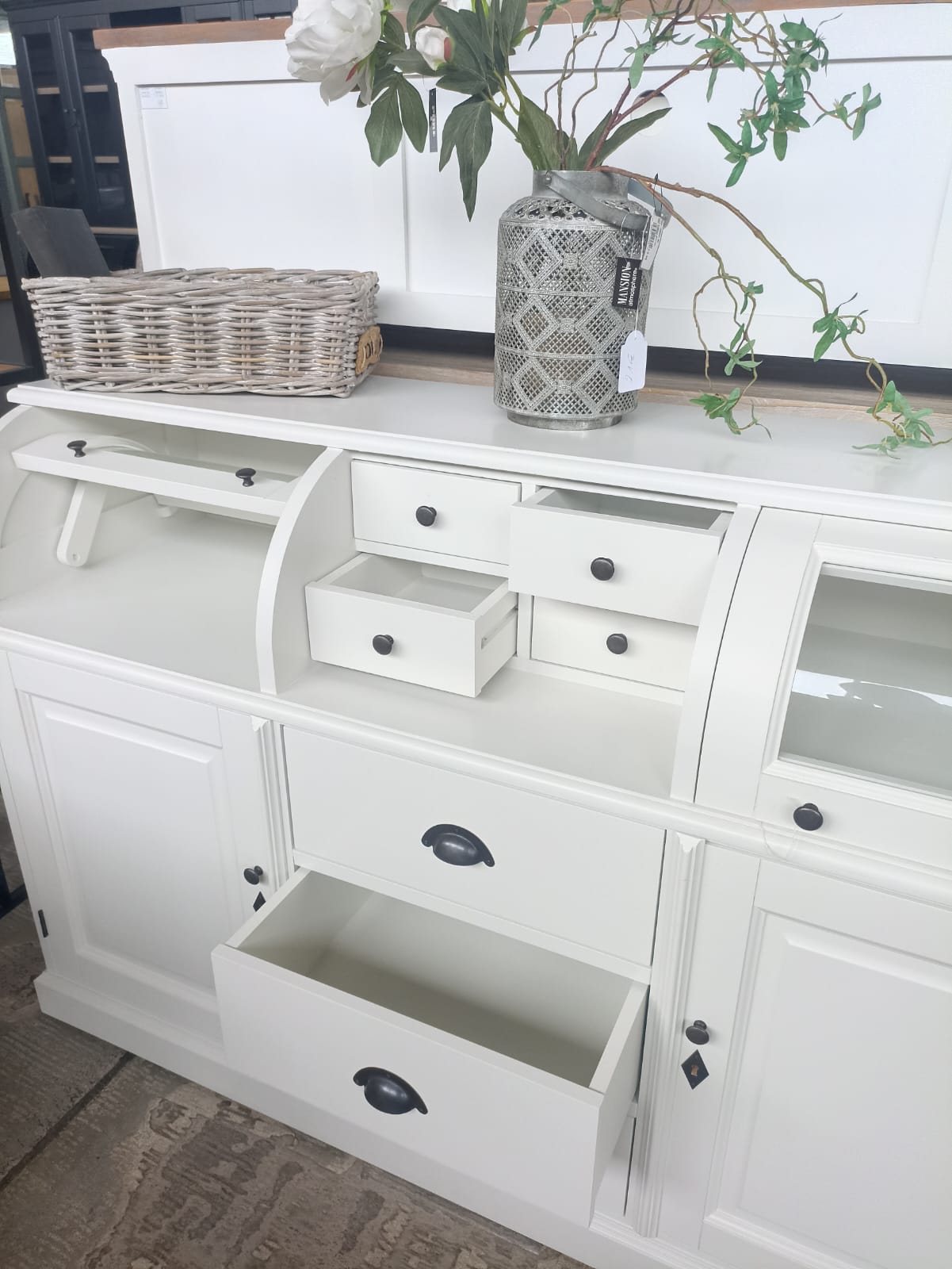 Das einzigartiges Sideboard im angesagten Landhaus-Stil ist ein hochwertiges und zeitloses Möbelstück, welches überall in Ihrem Haus einen prägenden Eindruck hinterlässt und eine gute Figur macht. Mit viel Stauraum. Das Sideboard ist weiß lackiert. Jedes Möbelstück ist ein handgefertigtes Unikat. Das Sideboard wird nicht nur Ihr Eigenheim in neuem Glanz erstrahlen lassen, sondern durch seine Langlebigkeit und Anblick Sie auf Dauer erfreuen.