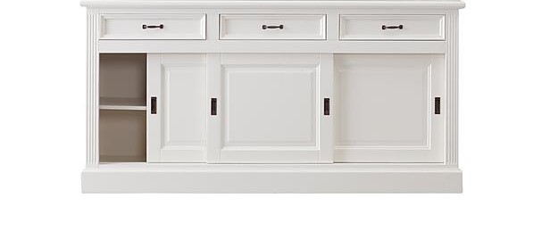 Eine schöne Kommode im Landhaus Stil. Die Kommode hat praktische Schiebetüren, ist vielseitig nutzbar und komplett weiß. Unsere Kommode 180cm im angesagten Landhaus-Stil ist ein zeitloses Möbelstück, welches überall in Ihrem Haus einen prägenden Eindruck hinterlässt. Nutzen Sie den großen Stauraum im Innenbereich, unterstreichen Sie durch die vielen Möglichkeiten mit den Wohnaccessoires den Landhaus-Stil. Die Kommode ist weiß lackiert und ist mit schönen Griffen aus Metall versehen.