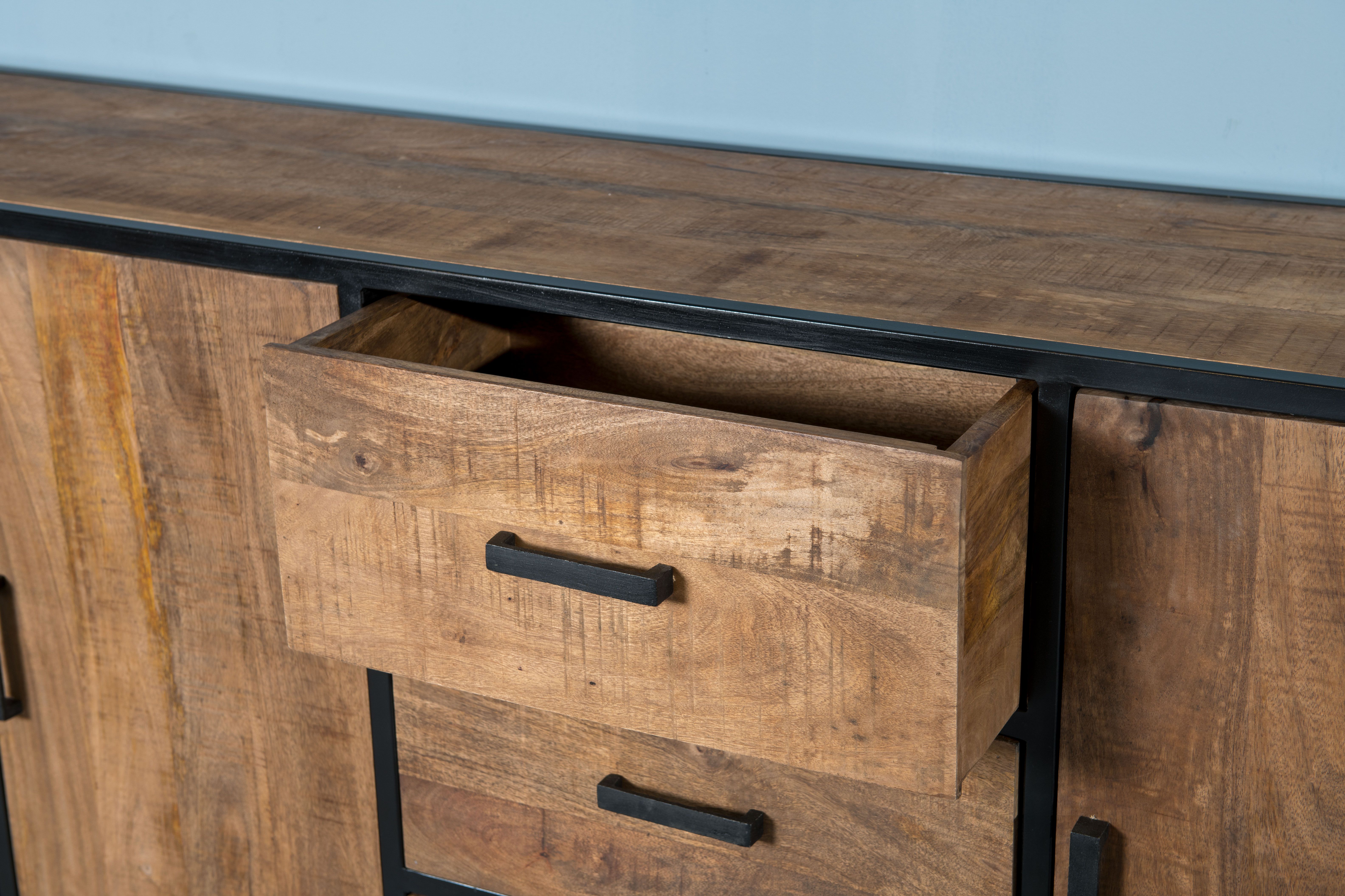 Diese Anrichte aus der Sturdy- Kollektion ist aus edlem Mangoholz gefertigt, welches dem Interieur eine warme Atmosphäre verleiht und hat 3 Türen und 3 Schubladen. Wie bereits der Name "Sturdy" verrät, unterscheidet sich diese Kollektion durch ihre Robustheit, welche diese Möbelstücke durch ihrer guten Qualität besonders langlebig macht. Die Kollektion zeichnet sich durch ihr minimalistisches Design aus, welches sich durch ihre markante Linienführung und lineare Flächen bemerkbar macht. Diese Anrichte hat zudem ein hochwertiges schwarzes Stahlgestell, die zu einer Erhöhung führt, die sie leicht und elegant wirken lässt. Diese Kommode wird neben seiner praktischen Funktion der Aufbewahrung auch perfekt dafür geeignet sein, ihr Wohnerlebnis mit dem Gefühl von Entspannung und Freiheit zu bereichern, wobei es jedem Zimmer einen zeitgemäßen Minimalistischen-Stil verleihen wird!
