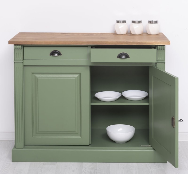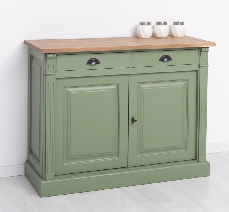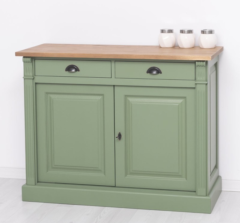Entdecken Sie die ideale Verbindung von Organisation und Präsentation mit unserem vielseitig einsetzbares Sideboard. Dieses Möbelstück vereint auf elegante Weise Funktionalität und Ästhetik. Diese Kommode bietet Stauraum hinter den zwei geschlossenen Türen und in den zwei Schubladen und ermöglicht gleichzeitig die ansprechende Präsentation Ihrer Lieblingsstücke. Das Design dieses Möbelstücks strahlt zeitlose Eleganz aus und passt sich nahtlos in verschiedene Einrichtungsstile ein. Es ist das perfekte Highlight für diejenigen, die sowohl praktische Lösungen als auch raffinierten Stil suchen. Mit seiner exzellenten Verarbeitung garantiert dieses Sideboard Langlebigkeit und Beständigkeit. Er überzeugt nicht nur mit praktischen Lösungen, sondern wird auch Ihre Freude und Bewunderung langfristig erhalten. Abmessungen: H: 90 cm, B: 116 cm, T: 51 cm Massivholz Möbel Landhausstil Arbeitsplatte 100% Kiefernholz Korpus 100% Kiefernholz Fertig montiert - 1 Teil