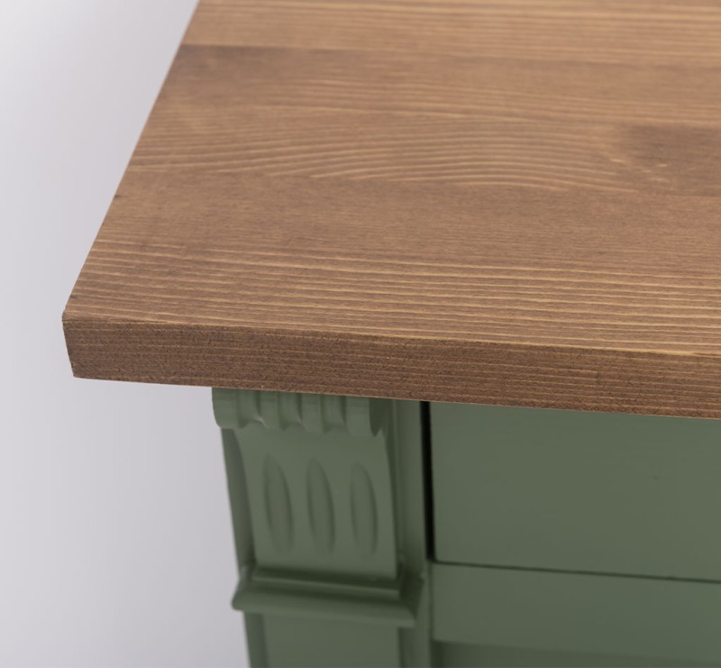 Entdecken Sie die ideale Verbindung von Organisation und Präsentation mit unserem vielseitig einsetzbarer Kommode. Dieses Möbelstück vereint auf elegante Weise Funktionalität und Ästhetik. Dieses Sideboard bietet Stauraum hinter einer geschlossenen Tür und in den drei Schubladen und ermöglicht gleichzeitig die ansprechende Präsentation Ihrer Lieblingsstücke. Das Design dieses Möbelstücks strahlt zeitlose Eleganz aus und passt sich nahtlos in verschiedene Einrichtungsstile ein. Es ist das perfekte Highlight für diejenigen, die sowohl praktische Lösungen als auch raffinierten Stil suchen. Mit seiner exzellenten Verarbeitung garantiert dieser Kommode Langlebigkeit und Beständigkeit. Er überzeugt nicht nur mit praktischen Lösungen, sondern wird auch Ihre Freude und Bewunderung langfristig erhalten. Abmessungen: H: 78 cm, B: 116 cm, T: 51 cm Korpusfarbe - frei wählbar Innenfarbe - frei wählbar Massivholz Möbel Landhausstil Arbeitsplatte 100% Kiefernholz Korpus 100% Kiefernholz Beschläge/Griffe wählbar Fertig montiert - 1 Teil Oberflächen und Farben sind frei wählbar. 36 Farben und 8 Oberflächen (lackiert/gewachst/natur usw.) - Andere Abmessungen und Sonderanfertigungen sind möglich. Bitte Fragen Sie uns.