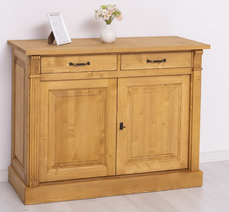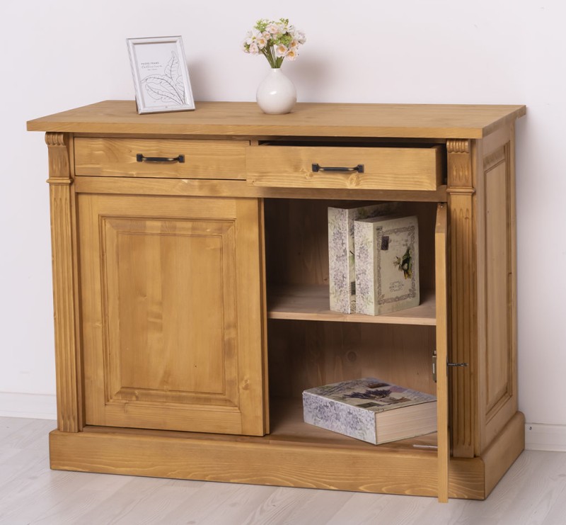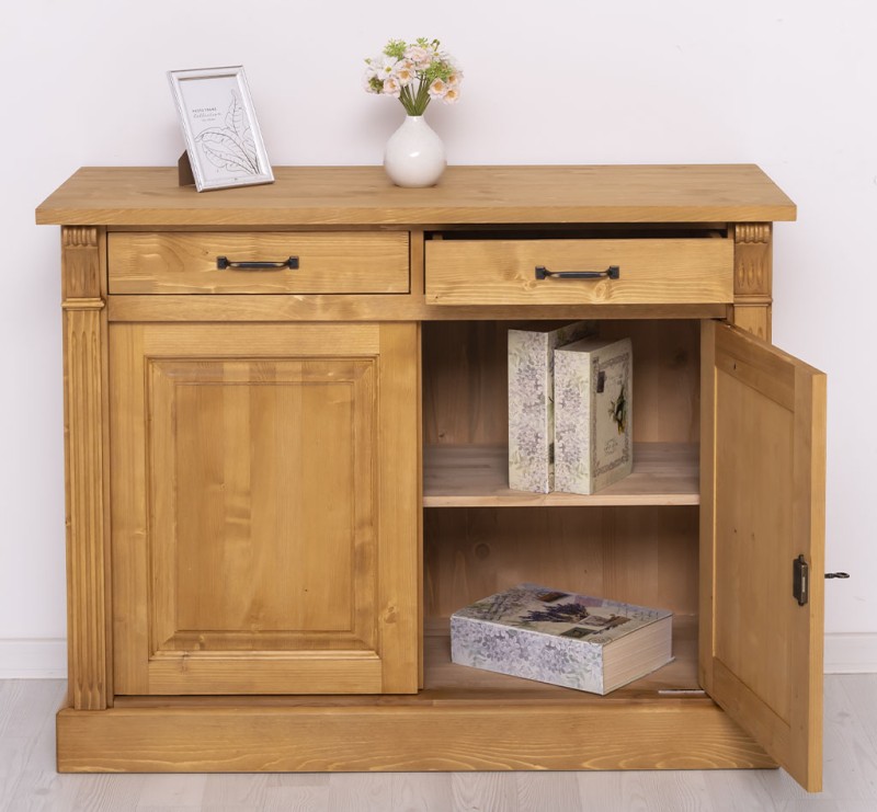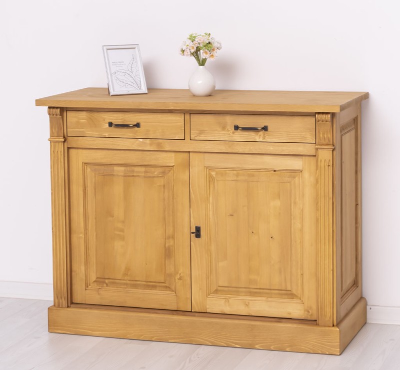 Entdecken Sie die ideale Verbindung von Organisation und Präsentation mit unserem vielseitig einsetzbares Sideboard. Dieses Möbelstück vereint auf elegante Weise Funktionalität und Ästhetik. Diese Kommode bietet Stauraum hinter den zwei geschlossenen Türen und in den zwei Schubladen und ermöglicht gleichzeitig die ansprechende Präsentation Ihrer Lieblingsstücke. Das Design dieses Möbelstücks strahlt zeitlose Eleganz aus und passt sich nahtlos in verschiedene Einrichtungsstile ein. Es ist das perfekte Highlight für diejenigen, die sowohl praktische Lösungen als auch raffinierten Stil suchen. Mit seiner exzellenten Verarbeitung garantiert dieses Sideboard Langlebigkeit und Beständigkeit. Er überzeugt nicht nur mit praktischen Lösungen, sondern wird auch Ihre Freude und Bewunderung langfristig erhalten. Abmessungen: H: 90 cm, B: 116 cm, T: 51 cm Massivholz Möbel Landhausstil Arbeitsplatte 100% Kiefernholz Korpus 100% Kiefernholz Fertig montiert - 1 Teil