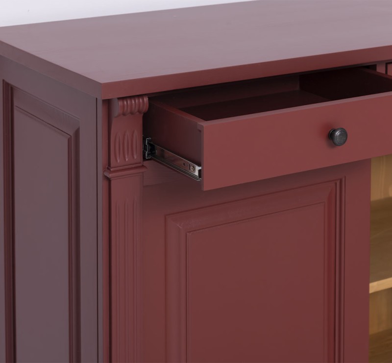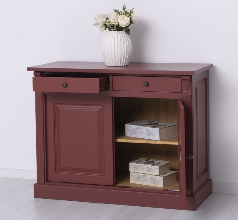 Entdecken Sie die ideale Verbindung von Organisation und Präsentation mit unserem vielseitig einsetzbarer Kommode. Dieses Möbelstück vereint auf elegante Weise Funktionalität und Ästhetik. Dieses Sideboard bietet Stauraum hinter einer geschlossenen Tür und in den drei Schubladen und ermöglicht gleichzeitig die ansprechende Präsentation Ihrer Lieblingsstücke. Das Design dieses Möbelstücks strahlt zeitlose Eleganz aus und passt sich nahtlos in verschiedene Einrichtungsstile ein. Es ist das perfekte Highlight für diejenigen, die sowohl praktische Lösungen als auch raffinierten Stil suchen. Mit seiner exzellenten Verarbeitung garantiert dieser Kommode Langlebigkeit und Beständigkeit. Er überzeugt nicht nur mit praktischen Lösungen, sondern wird auch Ihre Freude und Bewunderung langfristig erhalten. Abmessungen: H: 78 cm, B: 116 cm, T: 51 cm Korpusfarbe - frei wählbar Innenfarbe - frei wählbar Massivholz Möbel Landhausstil Arbeitsplatte 100% Kiefernholz Korpus 100% Kiefernholz Beschläge/Griffe wählbar Fertig montiert - 1 Teil Oberflächen und Farben sind frei wählbar. 36 Farben und 8 Oberflächen (lackiert/gewachst/natur usw.) - Andere Abmessungen und Sonderanfertigungen sind möglich. Bitte Fragen Sie uns.