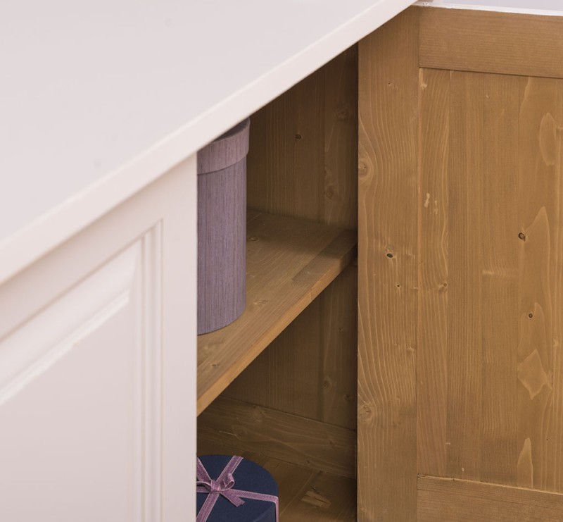 Entdecken Sie die ideale Verbindung von Organisation und Präsentation mit unserem vielseitig einsetzbarem Sideboard. Dieses Möbelstück vereint auf elegante Weise Funktionalität und Ästhetik. Diese Kommode bietet Stauraum hinter den zwei geschlossenen Türen und in den zwei Schubladen und ermöglicht gleichzeitig die ansprechende Präsentation Ihrer Lieblingsstücke. Das Design dieses Möbelstücks strahlt zeitlose Eleganz aus und passt sich nahtlos in verschiedene Einrichtungsstile ein. Es ist das perfekte Highlight für diejenigen, die sowohl praktische Lösungen als auch raffinierten Stil suchen. Mit seiner exzellenten Verarbeitung garantiert dieser Schrank Langlebigkeit und Beständigkeit. Er überzeugt nicht nur mit praktischen Lösungen, sondern wird auch Ihre Freude und Bewunderung langfristig erhalten. Abmessungen: H: 90 cm, B: 116 cm, T: 51 cm Massivholz Möbel Landhausstil Farbe Platte: P071 Korpus:P039 Arbeitsplatte 100% Kiefernholz Korpus 100% Kiefernholz Fertig montiert - 1 Teil