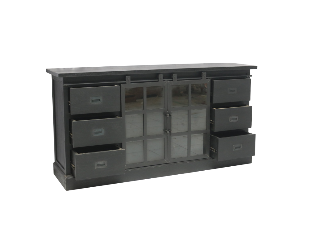 Die große Anrichte wurde aus recyceltem Teak gebaut hat 6 Schubladen und hat 2 Schiebetüren, welche auf einer Metallschiene aufgehängt ist. Die massiven Teakmöbel sind sehr belastbar und leicht zu reinigen und zu pflegen. Zeitlos attraktiv präsentiert sich ein Teakmöbel auch noch nach Jahren. Jedes Modell ist ein Unikat. Dieses Möbelstück wurde von traditionellen Handwerkern noch handgefertigt. Eine schöne naturbelassene Kommode. Dieses Möbelstück wird nicht nur Ihr Eigenheim in neuem Glanz erstrahlen lassen, sondern auch Sie durch seine Langlebigkeit und den Anblick auf Dauer erfreuen.