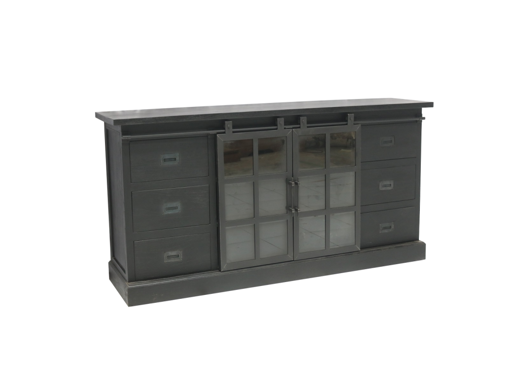 Das Sideboard wurde aus recyceltem Teak gebaut und hat sechs Schubladen und eine Schiebetür, welche auf einer Metallschiene aufgehängt ist. Die massiven Teakmöbel sind sehr belastbar und leicht zu reinigen und zu pflegen. Zeitlos attraktiv präsentiert sich ein Teakmöbel auch noch nach Jahren. Jedes Modell ist ein Unikat. Dieses Möbelstück wurde von traditionellen Handwerkern noch handgefertigt. Eine schöne naturbelassene Kommode. Dieses Möbelstück wird nicht nur Ihr Eigenheim in neuem Glanz erstrahlen lassen, sondern auch Sie durch seine Langlebigkeit und den Anblick auf Dauer erfreuen. Beschreibung Sideboard Teakholz Massivholz/Metall fertig montiert Maße Korpus: H/B/T: 93 x 180 x 50 cm