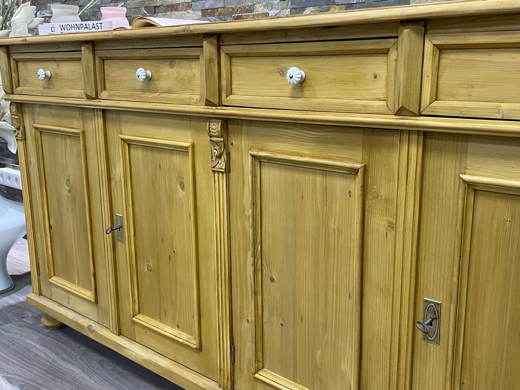 Eine schönes Sideboard aus Weichholz im Landhaus Stil. Das Sideboard wurde von erfahrenen Schreinern nach alten Vorlagen in massiver Bauweise von Hand liebevoll hergestellt und gewachst gewachst. Die großen Schubladen bieten genügt Stauraum an. Die Lieferung erfolgt komplett montiert. Kleine Unebenheiten in der Holzstruktur und Gebrauchsspuren sind gewollt und unterstreichen den antiken Charakter des Möbels. Es handelt sich um einen Nachbau aus Altholz.