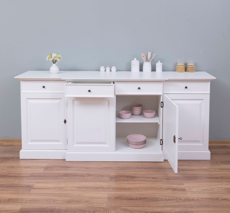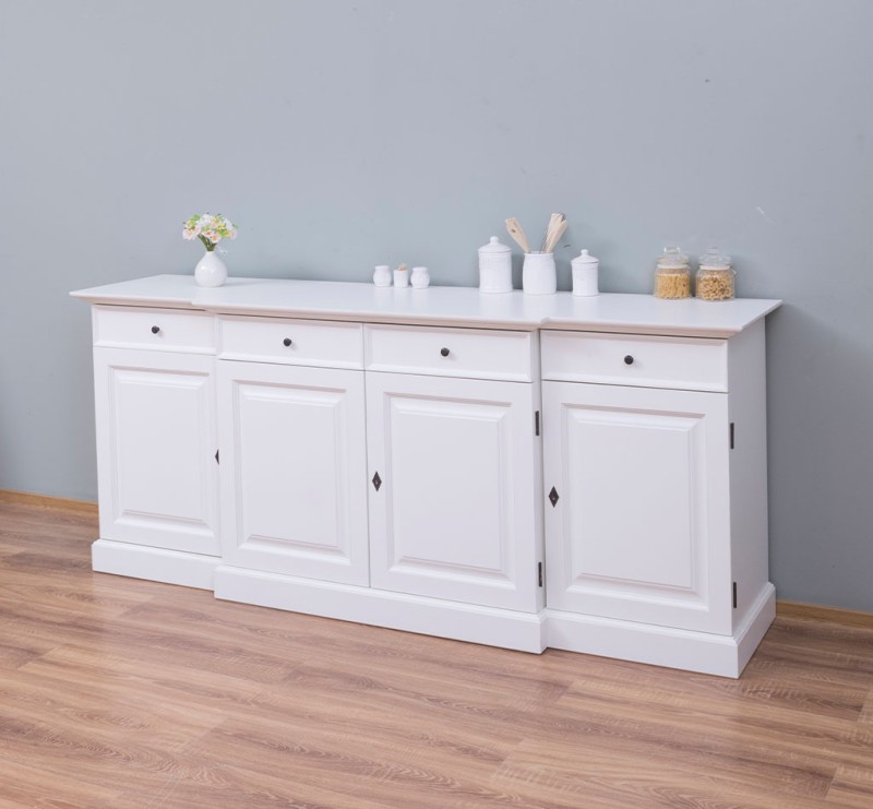 Landhaus Sideboard - weiß mit vier Türen und Schubladen, 215 cm breit - Kommode