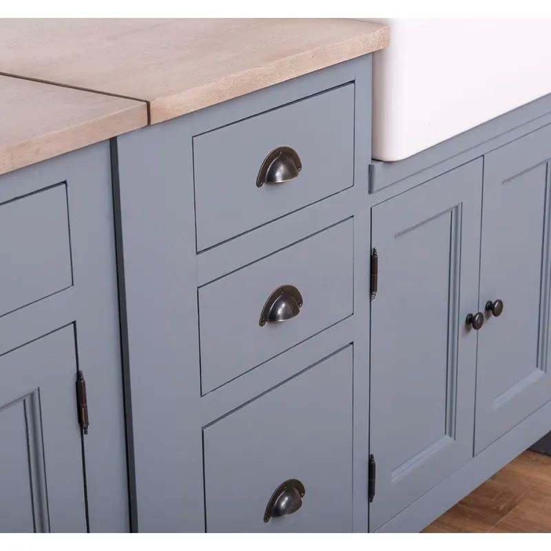 Sie werden die Qualität des 100 % massiven Holzes, die ökologische Farbe auf Wasserbasis sowie die mit Schutzlack behandelten, Eichenholz-Arbeitsplatten zu schätzen wissen. Die Küchenmodule sind bereits fertig montiert und lassen sich sowohl einzeln nutzen als auch flexibel zu einer vollständigen Küche kombinieren.