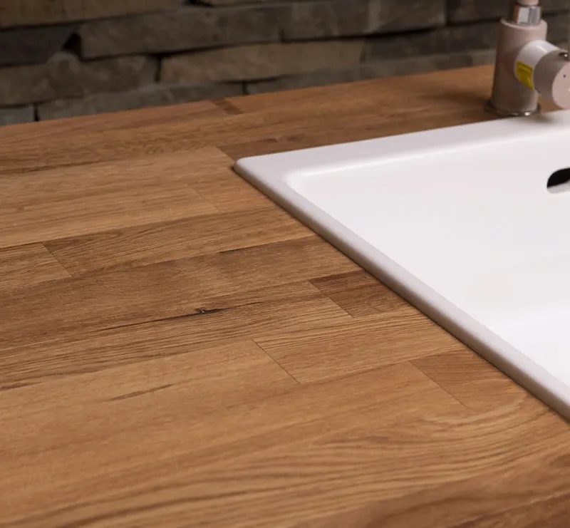 - Arbeitsplatte: Eiche, durchgehend, Farbe P061 (Acryl Natur lackiert)