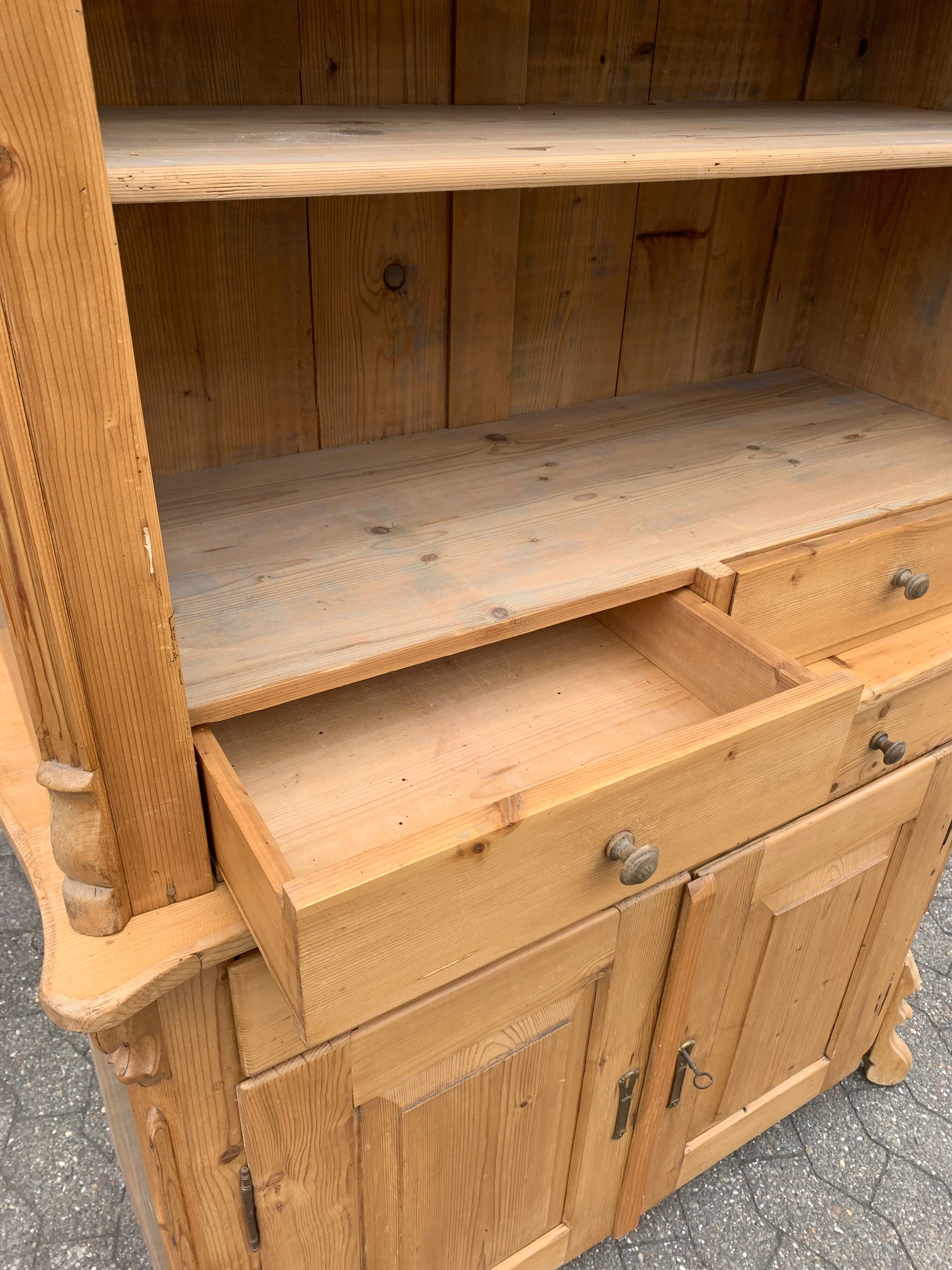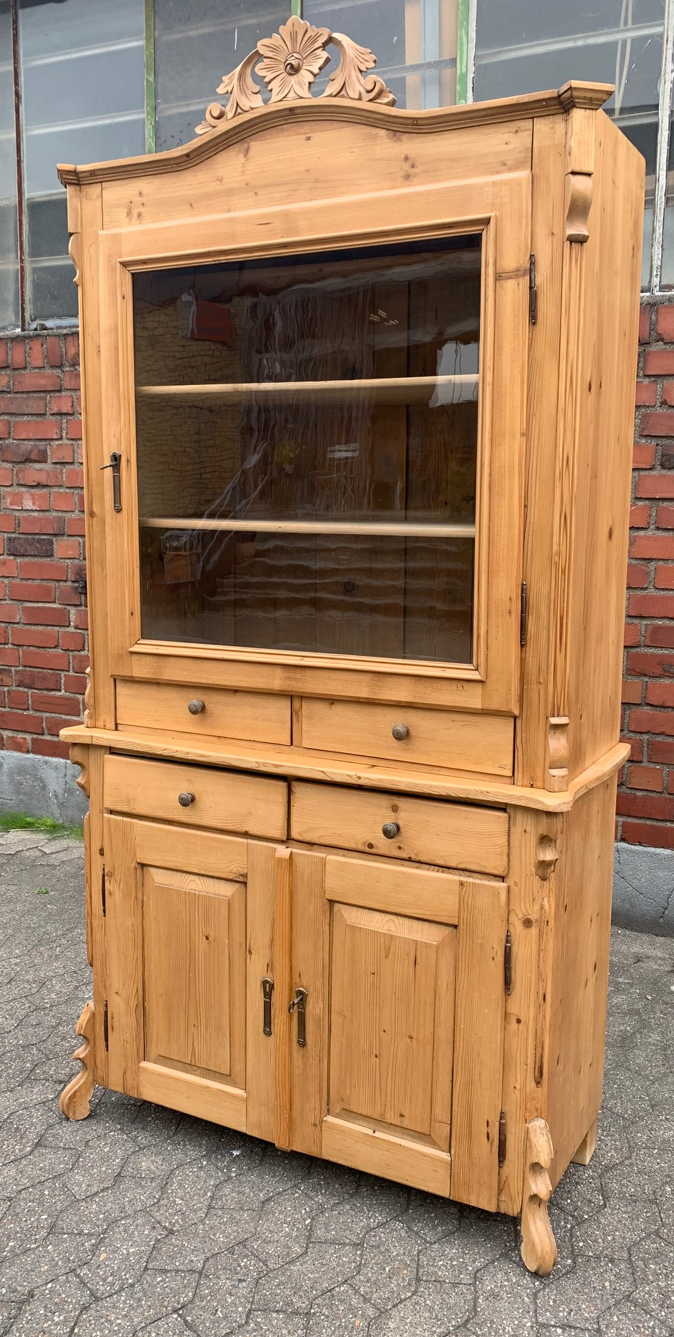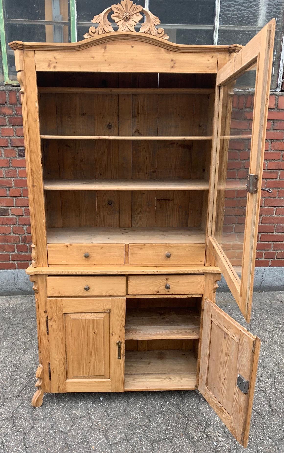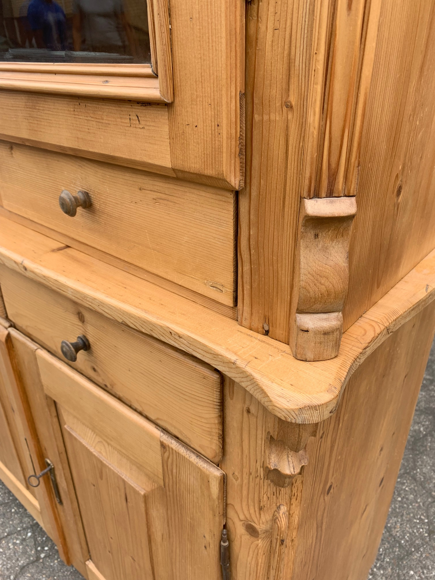 Eine Eckvitrine aus Weichholz. Eine viertürige Eckvitrine mit einer Schublade. Mit stabilen Regalböden. Das Möbelstück wurde von nach alten Vorlagen handgefertigt. Die vorhandenen Gebrauchspuren haben einen antiken Charakter und sind bewusst gewollt. Ein Schrank der Sie ein Leben lang begleiten wird! Beschreibung Schrank aus massivem Weichholz ein schönes Unikat gewachst und aufpoliert viertürig mit Innenausbau, Anlieferung aufgebaut Abmessungen: H/B/T- 181/81/46 cm