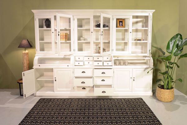 Der schöne Buffet Schrank im angesagten Landhaus-Stil ist ein hochwertiges und zeitloses Möbelstück, welches überall in Ihrem Haus einen prägenden Eindruck hinterlässt und eine gute Figur macht. Neben viel Stauraum im unteren Bereich, bietet Ihnen der obere Bereich mit Glasfront die Möglichkeit, den Landhaus-Stil durch Wohnaccessoires zu unterstreichen. Das Buffet ist weiß lackiert. Jedes Möbelstück ist ein handgefertigtes Unikat. Der Buffet Schrank wird nicht nur Ihr Eigenheim in neuem Glanz erstrahlen lassen, sondern durch seine Langlebigkeit und Anblick Sie auf Dauer erfreuen.