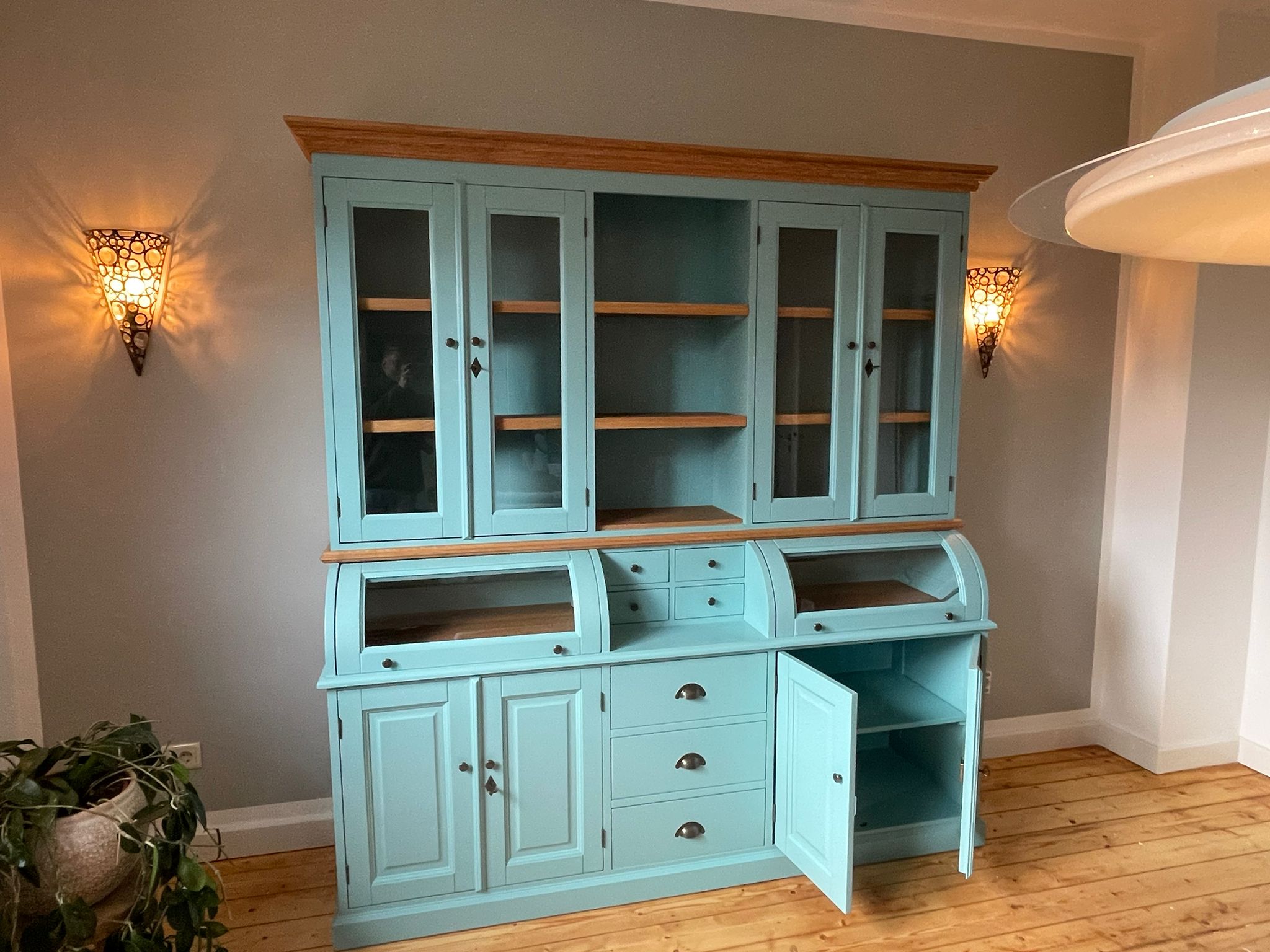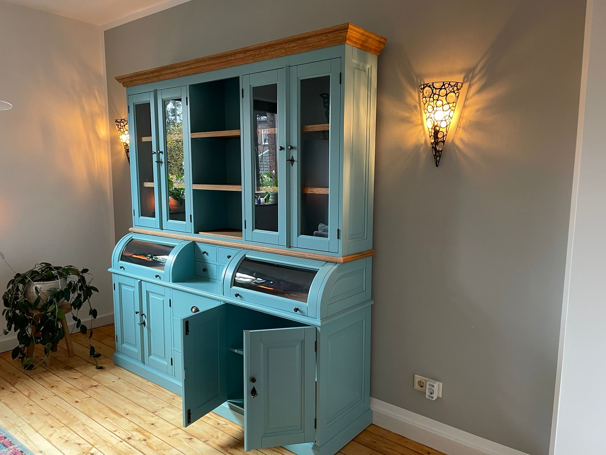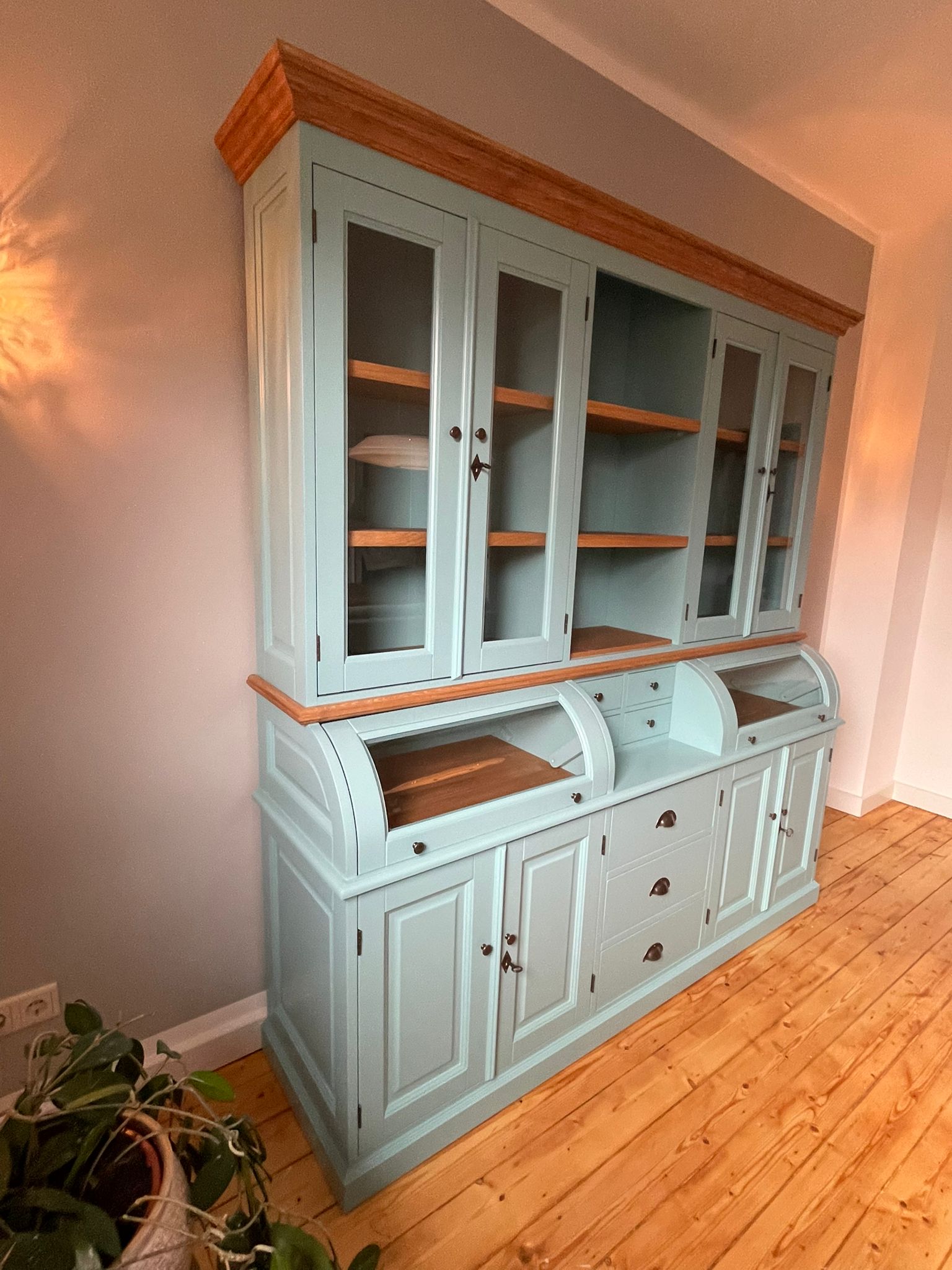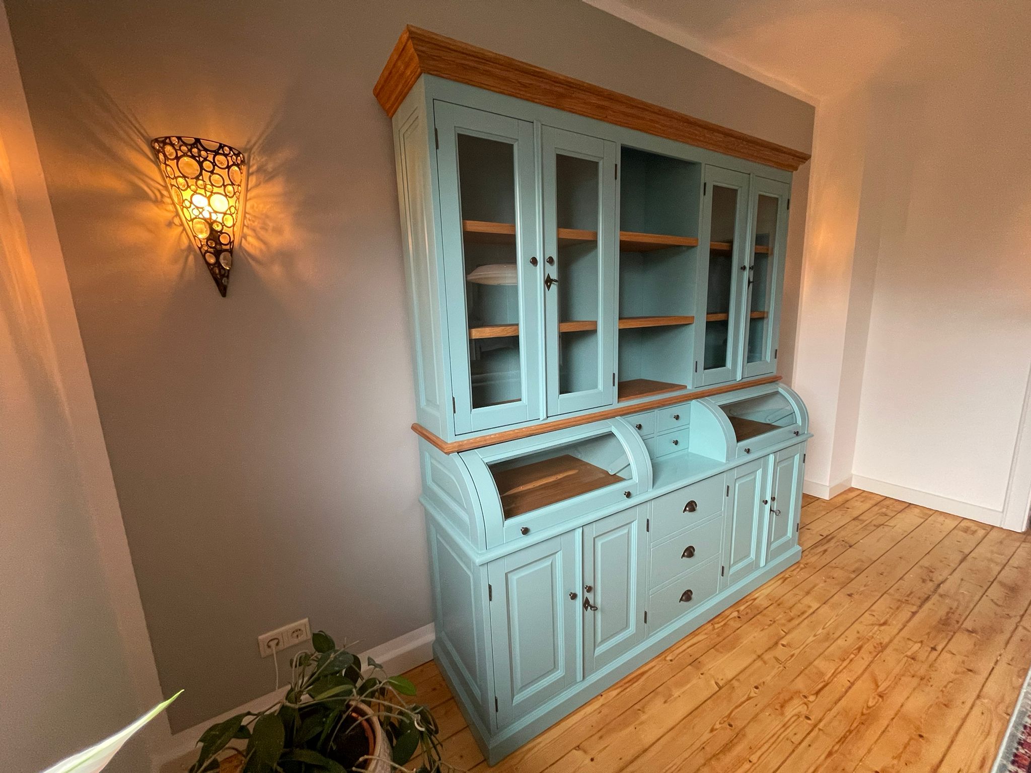 Der schöne Buffet Schrank im angesagten Landhaus-Stil ist ein hochwertiges und zeitloses Möbelstück, welches überall in Ihrem Haus einen prägenden Eindruck hinterlässt. Neben viel Stauraum im unteren Bereich, bietet Ihnen der obere Bereich mit einer Glasfront die Möglichkeit, durch Wohnaccessoires den Landhaus-Stil zu unterstreichen. Das Buffet wurde pastellgrün lackiert. Jedes Möbelstück ist ein handgefertigtes Unikat. Der Buffetschrank wird nicht nur Ihr Eigenheim in neuem Glanz erstrahlen lassen, sondern durch seine Langlebigkeit auf Dauer erfreuen.