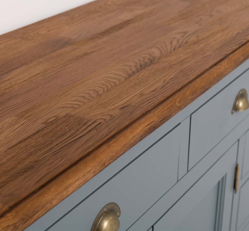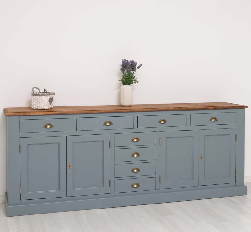 Entdecken Sie unseren hochwertiges Sideboard, das mit einer Breite von 239 cm, einer Höhe von 93 cm und einer Tiefe von 47 cm nicht nur funktional, sondern auch ein echter Blickfang in Ihrer Küche oder Wohnimmer ist. Diese große Anrichte überzeugt durch seine robuste Bauweise und die Verwendung von 100 % massivem Kiefernholz für den Korpus sowie 100 % massivem Eichenholz für die Oberseite.