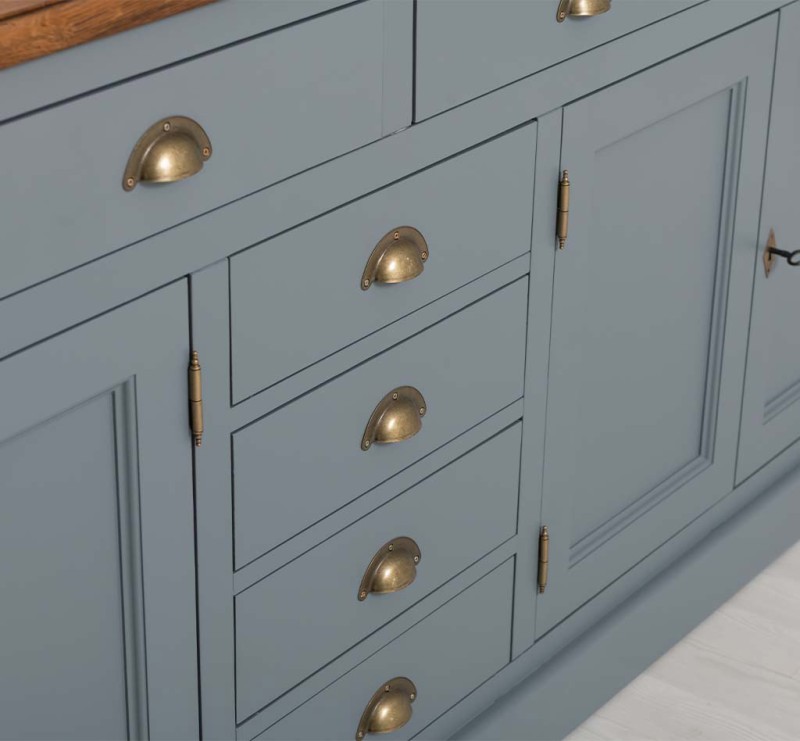 Ein romantisches Landhaus Buffet aus Weichholz mit großen Schubladen und schönen Muschelgriffen. Der Buffetschrank wurde von Hand bearbeitet und aufwendig mit viel Liebe zum Detail hergestellt. Der Innenausbau beinhaltet stabile Regalböden. Der 2-teilige Buffet Schrank ist in unserer Fachwerkstatt hergestellt worden und befindet sich in einem guten wohnfertigen Zustand. Ein Massivholz Buffet im angesagten antik Stil, welches überall in Ihrem Haus einen prägenden Eindruck hinterlässt. Neben viel Stauraum in den Schubladen, lässt der obere Stauraum viel Platz für Ideen und dekorative Accessoires. Das Buffet ist aus Altholz hergestellt. Abmessungen: H/B/T- ca. 202/185/55 cm Weichholz Buffet ein schönes Unikat von Hand bearbeitet fertig montiert 2-teilig