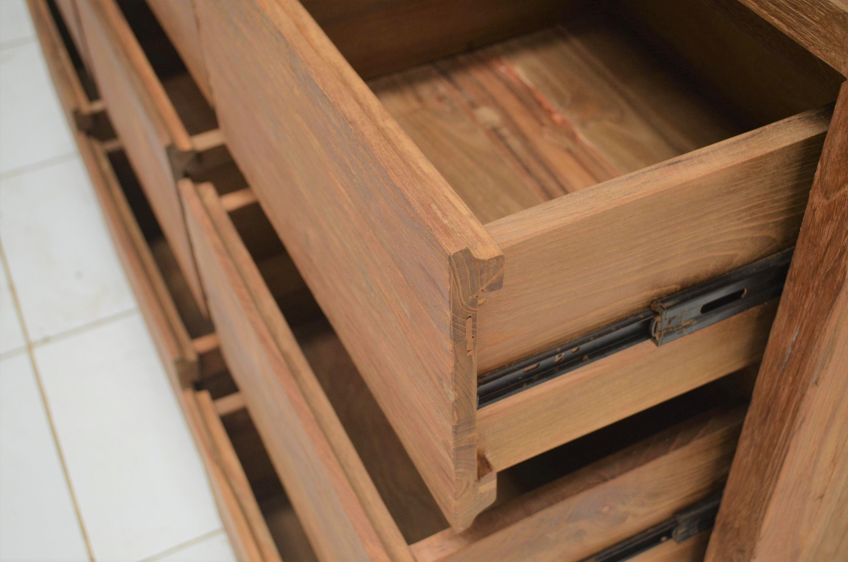 Der große Teak-Schrank wurde aus recyceltem Teakholz gebaut und hat somit einen ganz eigenen Charme. Die massiven Teakmöbel sind sehr belastbar, leicht zu reinigen und problemlos zu pflegen. Zeitlos attraktiv präsentiert sich ein Teakmöbel auch noch nach Jahren. Jedes Modell ist ein Unikat. Dieses Möbelstück wurde von traditionellen Handwerkern handgefertigt. Ein schöner naturbelassener Schrank mit viel Stauraum. Dieses Möbelstück wird nicht nur Ihr Eigenheim in neuem Glanz erstrahlen lassen, sondern auch Sie durch seine Langlebigkeit auf Dauer erfreuen.