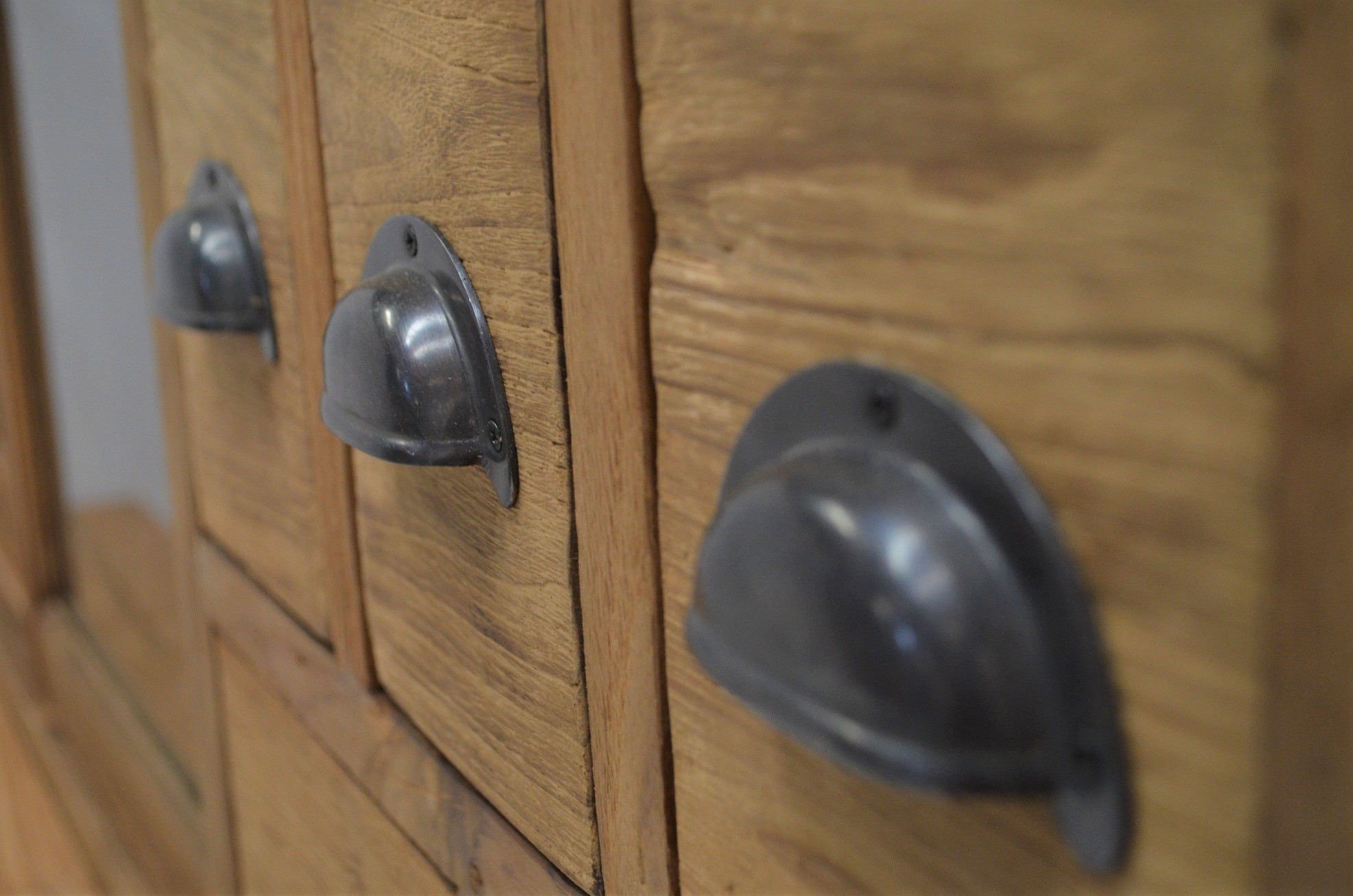 Landhaus Buffet Schrank Malta – Massives Teakholz im klassischen Landhausstil Der Landhaus Buffet Schrank Malta ist ein hochwertiges Massivholz-Möbelstück aus recyceltem Teakholz, das durch seine warme Maserung und den einzigartigen Charakter jedes Einzelstücks überzeugt. Mit seinem großzügigen Platzangebot und dem charmanten Landhaus-Look ist er die perfekte Wahl für Wohnzimmer, Esszimmer, Arbeitszimmer oder Wohnküche. Das zweiteilige Buffet kombiniert offene Regalböden und geschlossene Schrankbereiche mit zahlreichen Schubladen – ideal für Geschirr, Gläser, Bücher oder Dekoration. Die Muschelgriffe aus Messing unterstreichen den Landhausstil und runden das Design harmonisch ab. Besondere Merkmale: Gefertigt aus recyceltem Teakholz – nachhaltig & langlebig Massivholz mit wunderschöner, natürlicher Maserung Viel Stauraum durch stabile Regalböden und viele Schubladen Muschelgriffe aus Messing – typisches Landhausdetail 2-teilig & fertig montiert – sofort einsatzbereit Maße: H 220 cm x B 210 cm x T 56 cm Jedes Buffet ist ein handgefertigtes Unikat, das nicht nur funktionalen Stauraum bietet, sondern auch ein echter Blickfang in jedem Zuhause ist. Bringen Sie mit dem Buffet Schrank Malta aus Teakholz ein Stück zeitlose Eleganz und praktischen Stauraum in Ihr Zuhause – ein Möbelstück fürs Leben.