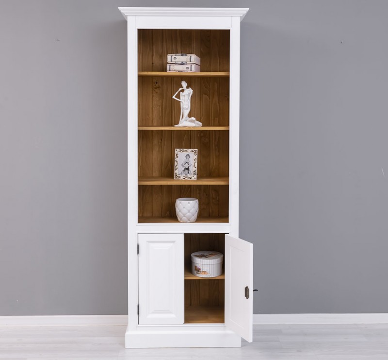 Entdecken Sie die perfekte Kombination von Stauraum und Präsentationsfläche mit unserem vielseitigen Bücherregal. Dieses Möbelstück bietet nicht nur auf den Regalböden viel Platz für Ihre Büchersammlung oder Dekorationsobjekte, sondern verfügt auch über einen geschlossenen Bereich hinter zwei massiven Türen. Unser Bücherregal mit einem offenem und einem geschlossenen Bereich verbindet die Freiheit der Gestaltung Ihrer Wohnräume mit einem ästhetischen Design. Es ermöglicht Ihnen, sowohl Ihre wertvollsten Besitztümer zu präsentieren als auch private Gegenstände ordentlich zu verstauen. Die Regalböden erlauben Ihnen die stilvolle Präsentation Ihrer Lieblingsbücher oder Dekorationen, während die geschlossene Türen diskreten Stauraum für persönliche Gegenstände bieten. Diese ausgewogene Kombination schafft ein ansprechendes visuelles Gleichgewicht. Das Design dieses Möbelstücks fügt sich harmonisch in verschiedene Einrichtungsstile ein. Es passt sowohl in moderne als auch klassische Umgebungen und verleiht jedem Raum einen Hauch von Eleganz. Die erstklassige Verarbeitung garantiert Langlebigkeit und Zuverlässigkeit. Dieses Bücherregal wird nicht nur Ihre Räume bereichern, sondern auch langfristige Zufriedenheit und Bewunderung schenken.   Abmessungen: H: 210 cm, B: 79 cm, T: 39 cm Massivholz Möbel  Landhausstil 100% Kiefernholz verschiedene Farben wählbar Fertig montiert - 1-Teil Oberflächen und Farben sind frei wählbar. 36 Farben und 8 Oberflächen (lackiert/gewachst/natur usw.) - Andere Abmessungen und Sonderanfertigungen sind möglich. Bitte Fragen Sie uns.
