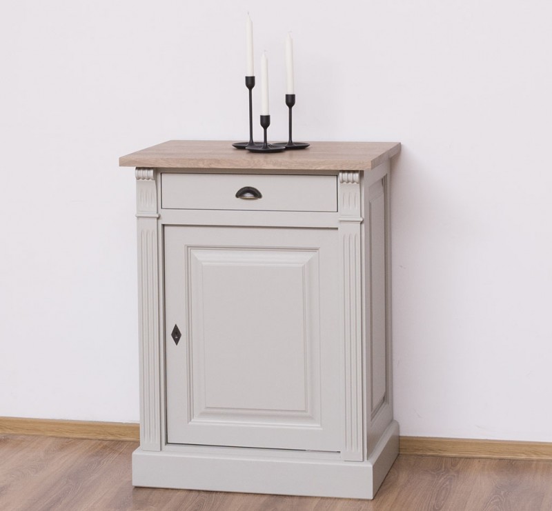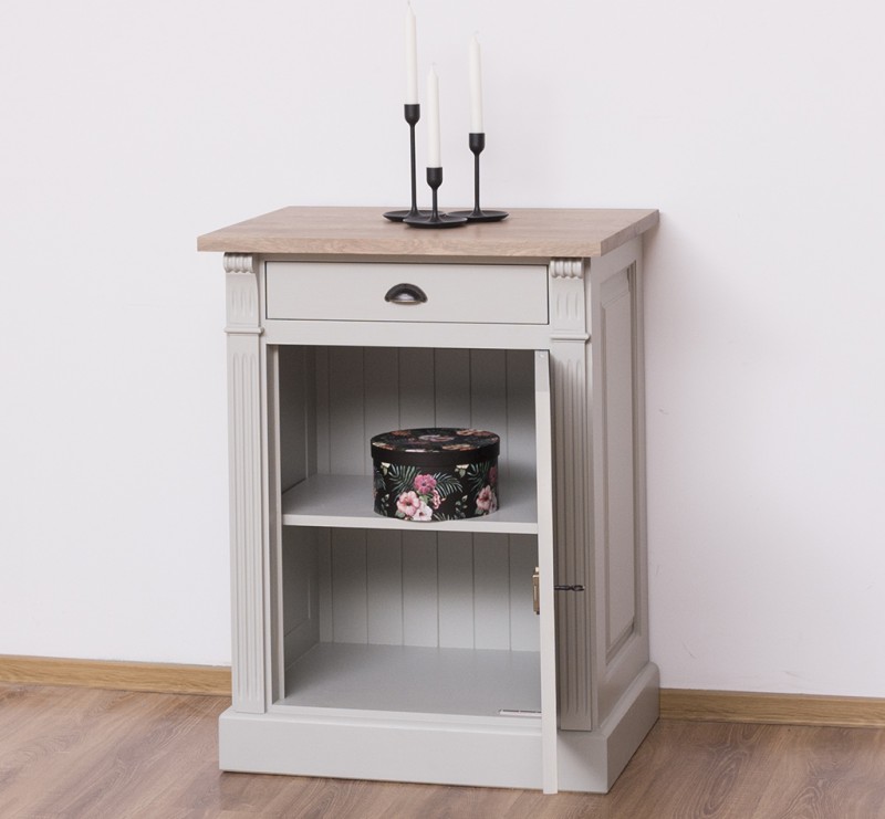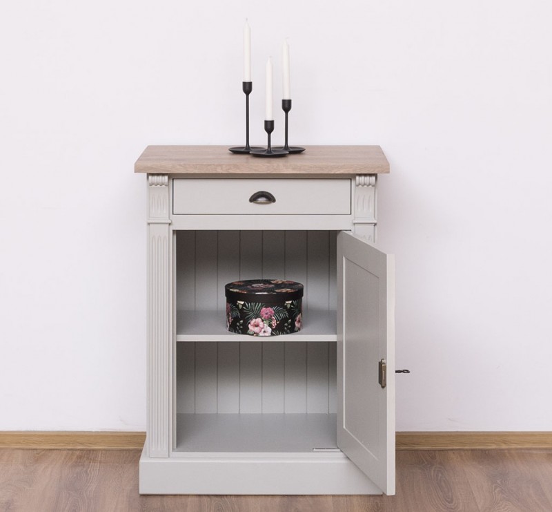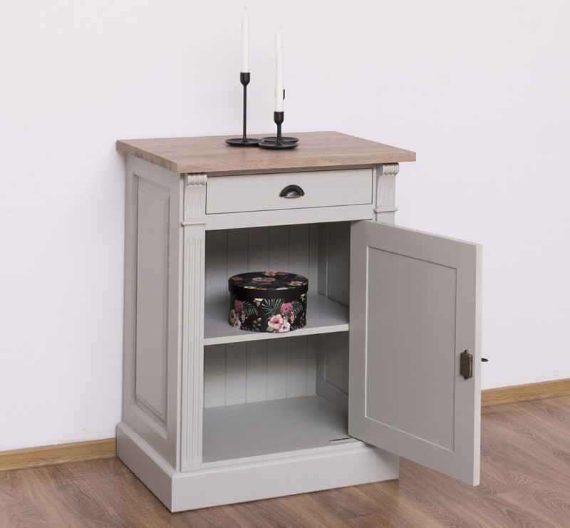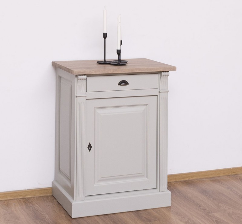 Entdecken Sie die ideale Verbindung von Organisation und Präsentation mit unserem vielseitig einsetzbaren Kommode. Dieses Möbelstück vereint auf elegante Weise Funktionalität und Ästhetik. Dieses Sideboard bietet Stauraum hinter einer geschlossenen Tür und in der Schublade und ermöglicht gleichzeitig die ansprechende Präsentation Ihrer Lieblingsstücke. Das Design dieses Möbelstücks strahlt zeitlose Eleganz aus und passt sich nahtlos in verschiedene Einrichtungsstile ein. Der Korpus des Produkts besteht zu 100 % aus massivem Kiefernholz und die Oberseite aus 100 % massivem Eichenholz.