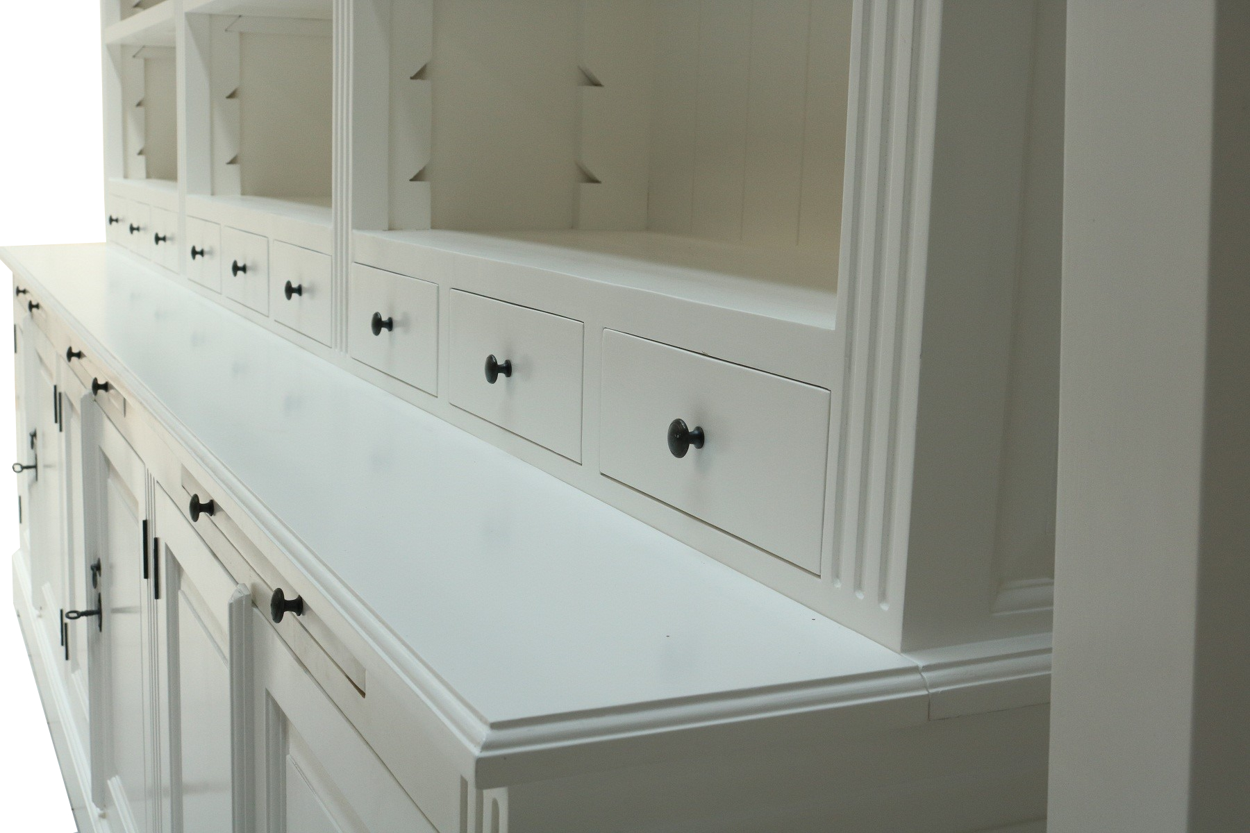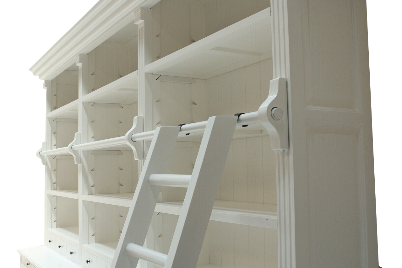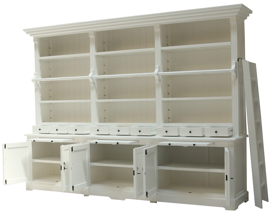 Die schöne Bücherwand im angesagten Landhaus-Stil ist ein hochwertiges, zeitloses Möbelstück, welches überall in Ihrem Haus einen prägenden Eindruck hinterlässt und eine gute Figur macht. Neben viel Stauraum im oberen Teil mit viel Platz für Ideen, dekorative Accessoires und Bücher, bietet der untere Stauraum mit Türen und Schubladen noch zusätzliche Ablagemöglichkeiten. Die Beschläge, Griffe und Applikationen aus Metall unterstreichen den stilvollen Landhaus Stil. Die Bücherwand wird mehrteilig gebaut, damit Sie auch in der Zukunft flexibel bleiben können. Das Regal hat auch eine stabile Leiter. Die große Regalwand wird nicht nur Ihr Eigenheim in neuem Glanz erstrahlen lassen, sondern durch seine Langlebigkeit und Anblick Sie auf Dauer erfreuen.