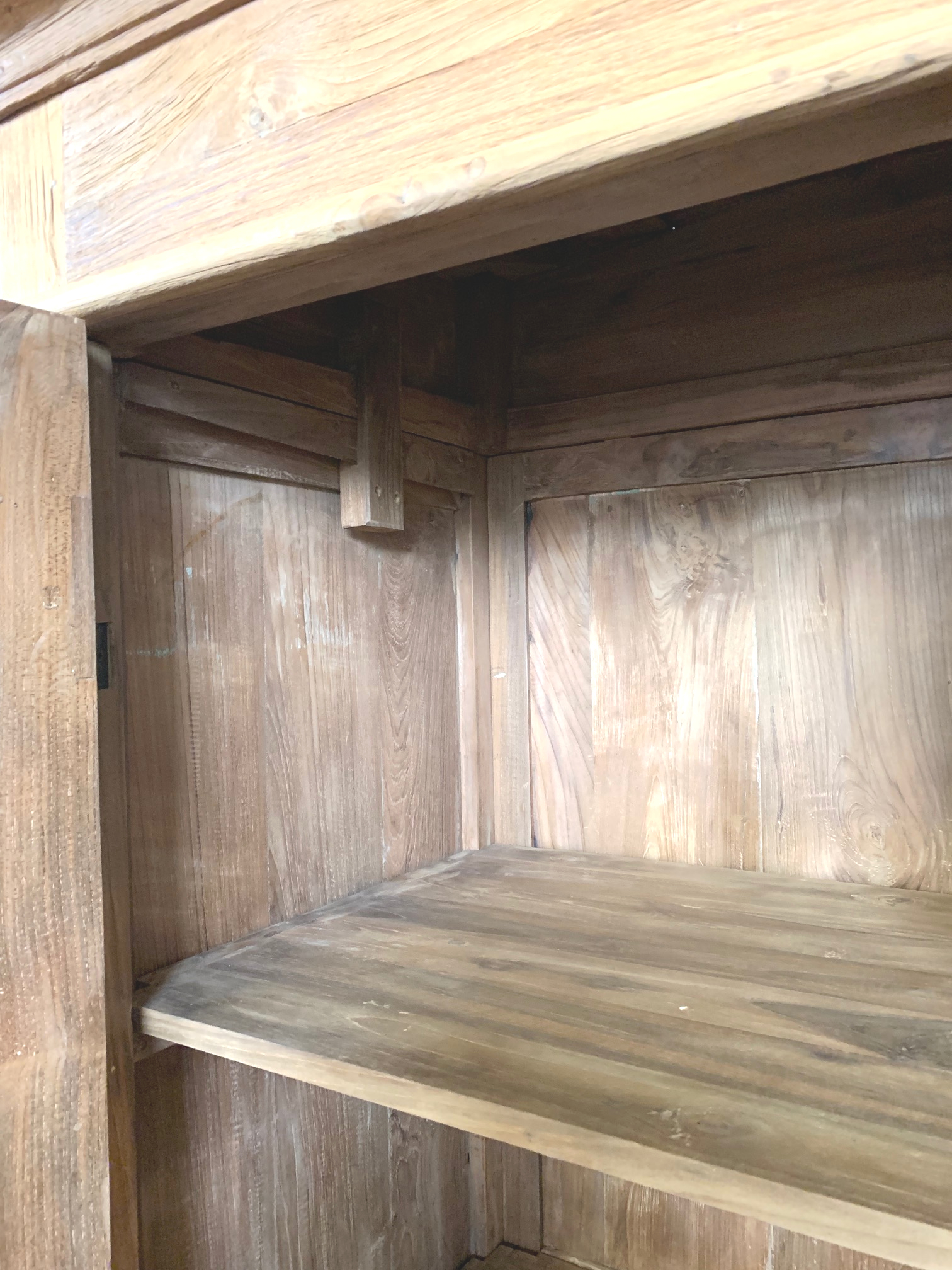 Der große Schrank wurde aus recyceltem Teakholz gebaut und hat dadurch einen ganz eigenen Charme. Unsere massiven Teakmöbel sind sehr belastbar und leicht zu pflegen. Zeitlos attraktiv präsentiert sich ein Teakmöbel auch noch nach Jahren. Jedes Modell ist ein Unikat. Der Schrank ist ein wahres Raumwunder. Mit stabilen Regalböden auch als Geschirr-oder Wäscheschrank nutzbar. Ein schönes Naturholz-Produkt. Ein Schrank mit kolonialen Charakter der Sie ein Leben lang begleiten wird!
