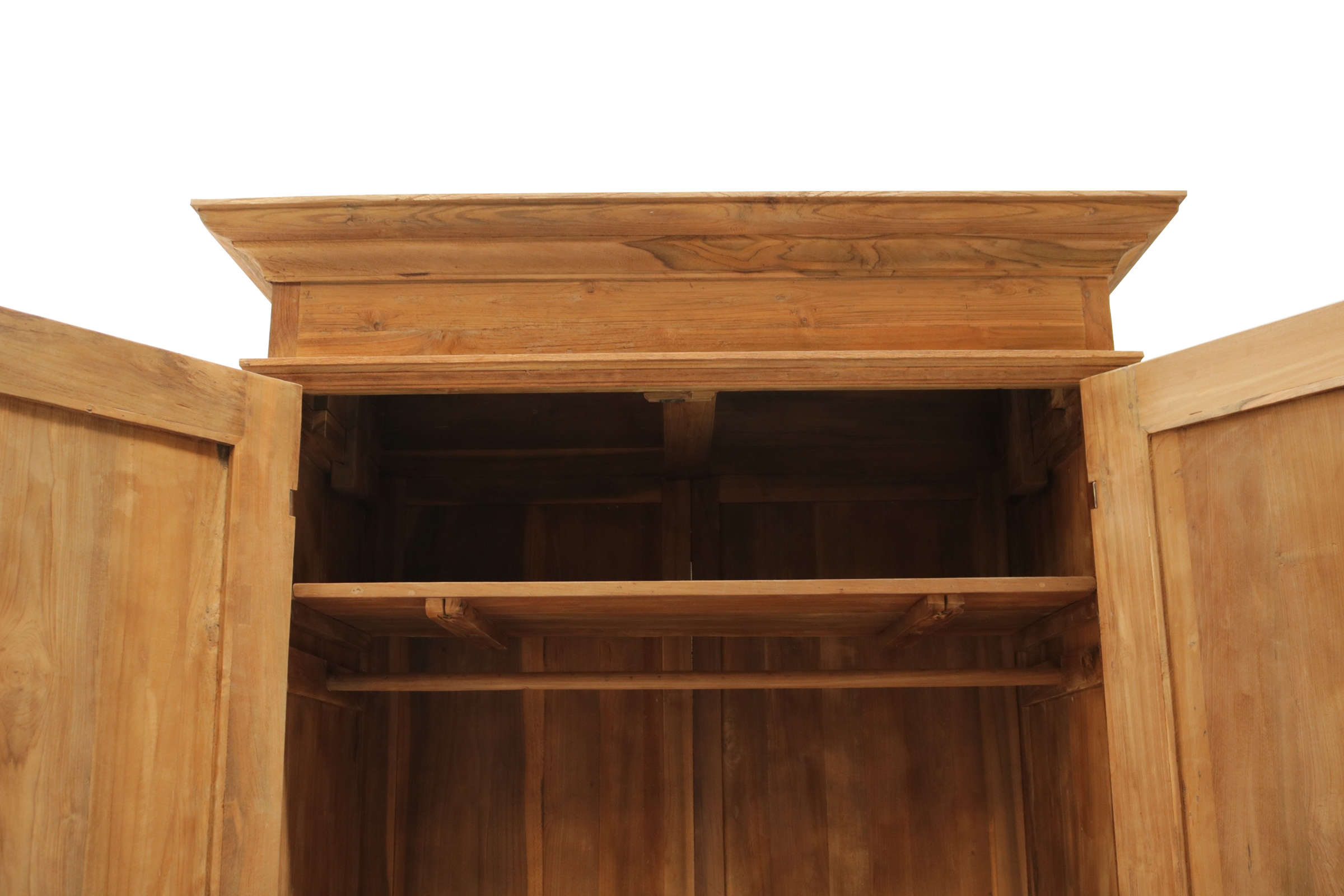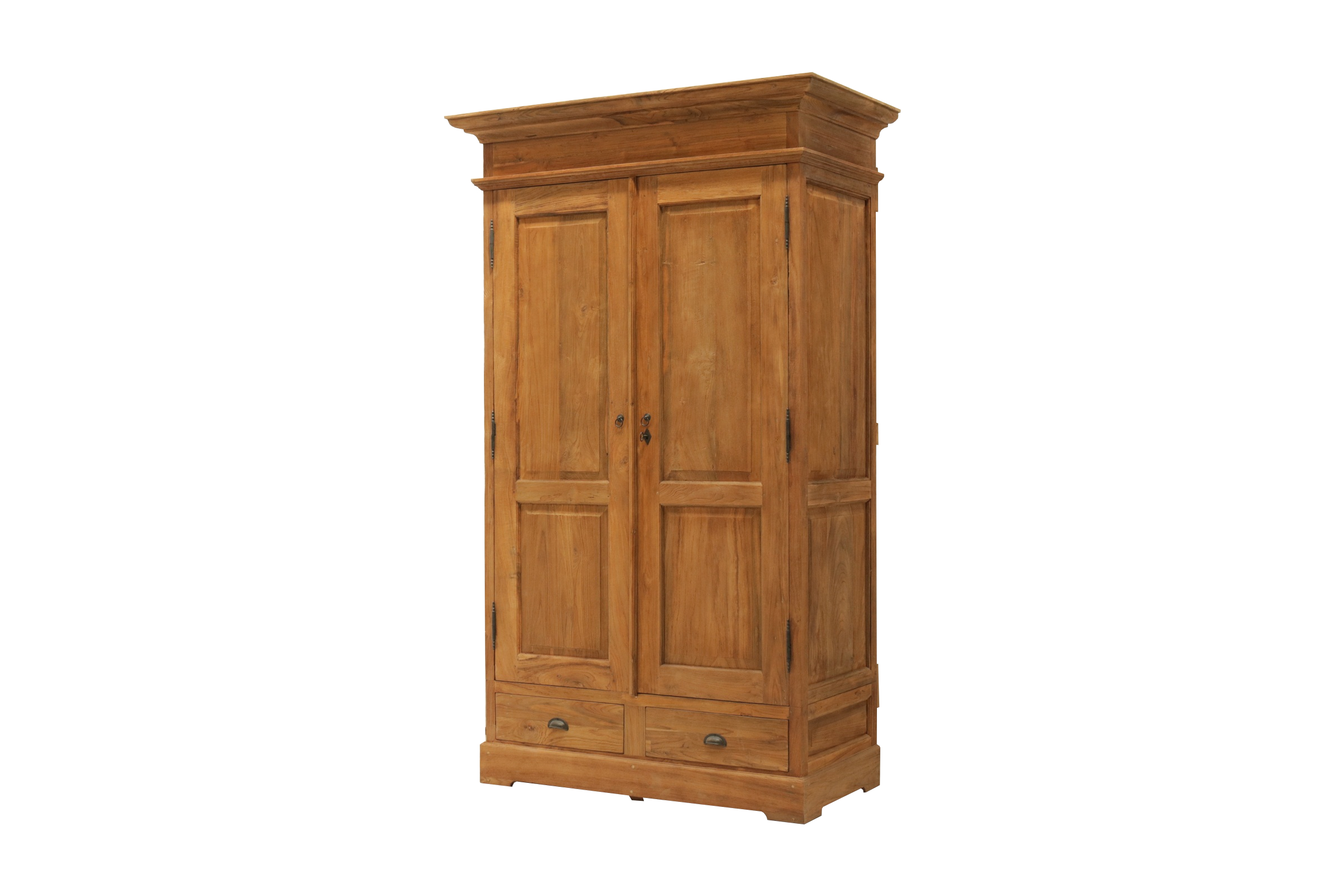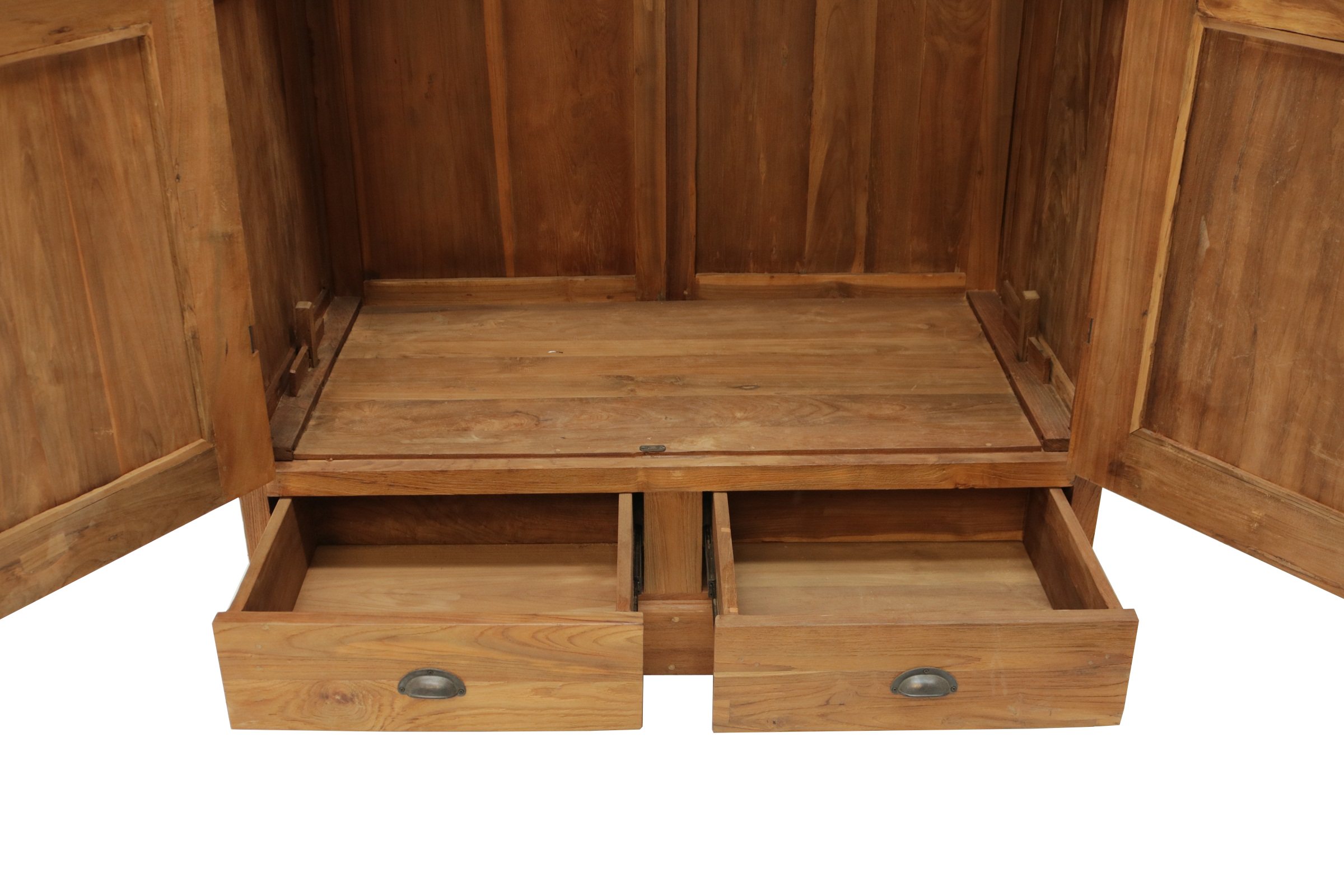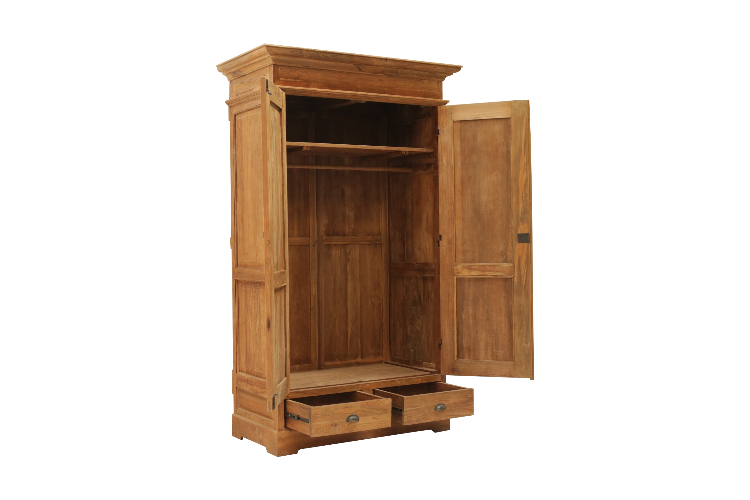 Der Schrank wurde aus recyceltem Teakholz gebaut. Die Holzoberfläche ist leicht gebürstet. Dadurch hat der Schrank eine wunderschöne warme Ausstrahlung. Ob im Schlafzimmer, Kinderzimmer oder im Wohnzimmer als Geschirrschrank, dieser Schrank wird garantiert auch bei Ihnen ein Platz finden. Mit einer Kleiderstange und einem Regalboden. Die zwei großen Schubladen bieten zusätzlichen Stauraum an. Jeder Schrank ist individuell gefertigt und somit ein Unikat. Unsere Teak Schränke sind nach alten Vorlagen gebaut und zerlegbar.