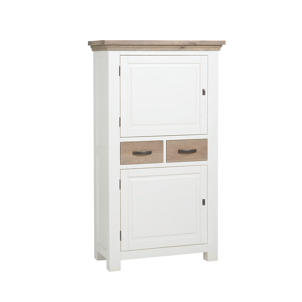 Der Schrank Parma Toscana 140 cm ist aus rustikaler Eiche und Kiefer gefertigt. Dieses Möbelstück enthält zwei Türen und drei Schubladen, die sehr nützlich sind, um alle möglichen Dinge zu verstauen. Kombinieren Sie diesen Artikel mit den anderen Möbeln aus unserer Parma/Toscana-Kollektion! Die Möbelkollektion Parma/Toscana ist aus rustikaler Eiche und Kiefer gefertigt. Die Eichenholzteile sind leicht gebürstet und mit einem Öl veredelt. Der weiße Kiefernholzrahmen der Möbel ist an einigen Stellen leicht angeschliffen, was dieser Lifestyle-Möbelserie eine schöne ländliche Ausstrahlung verleiht. Die Abmessungen:ca.: Höhe 200 cm - Breite 140 cm - Tiefe 45 cm. fertig montiert stabile Regalböden Landhaus-Stil Massivholz