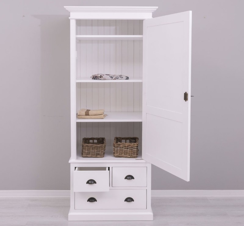 Dieser Kleiderschrank im Landhausstil ist ein echter Blickfang und wirklich praktisch. Der Schrank vereint auf elegante Weise Funktionalität und Ästhetik. Es bietet Stauraum hinter einer großen Tür im oberen Bereich, sowie in den drei darunter liegenden Schubladen. Hinter der Tür im Inneren befinden sich drei feste Einlegeböden, aber auch eine Kleiderstange. Es müssen nicht alle Elemente eingebaut werden, daher ist die Nutzung des Schrankes in mehreren Varianten möglich. Das Design dieses Möbelstücks strahlt zeitlose Eleganz aus und passt sich nahtlos in verschiedene Einrichtungsstile ein. Es ist das perfekte Highlight für diejenigen, die sowohl praktische Lösungen als auch raffinierten Stil suchen.
