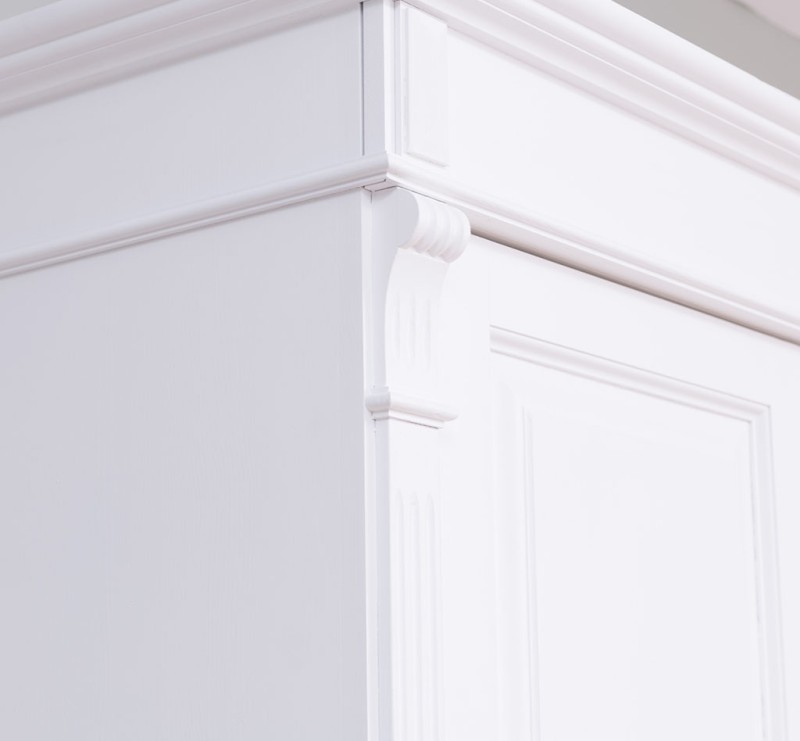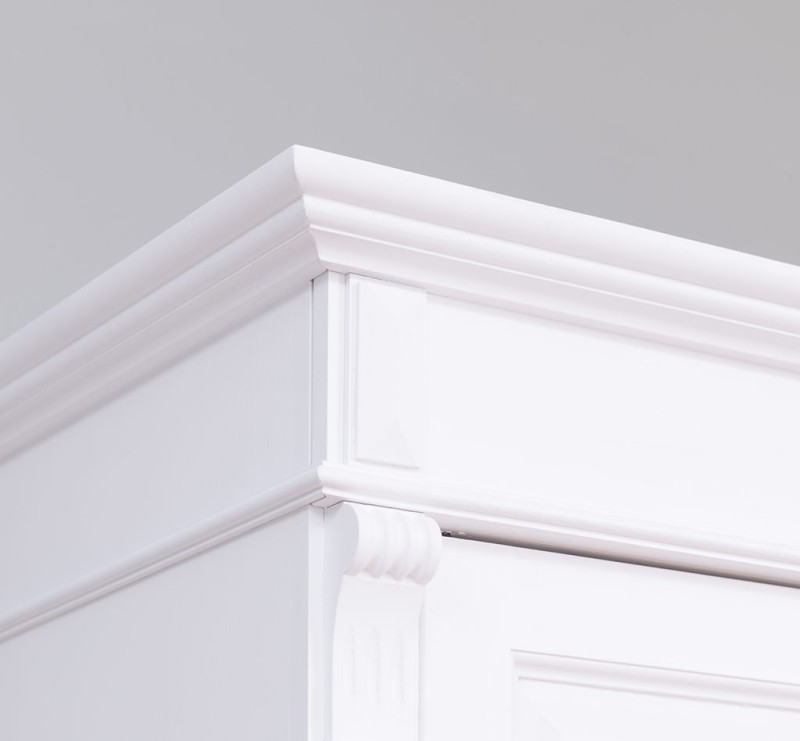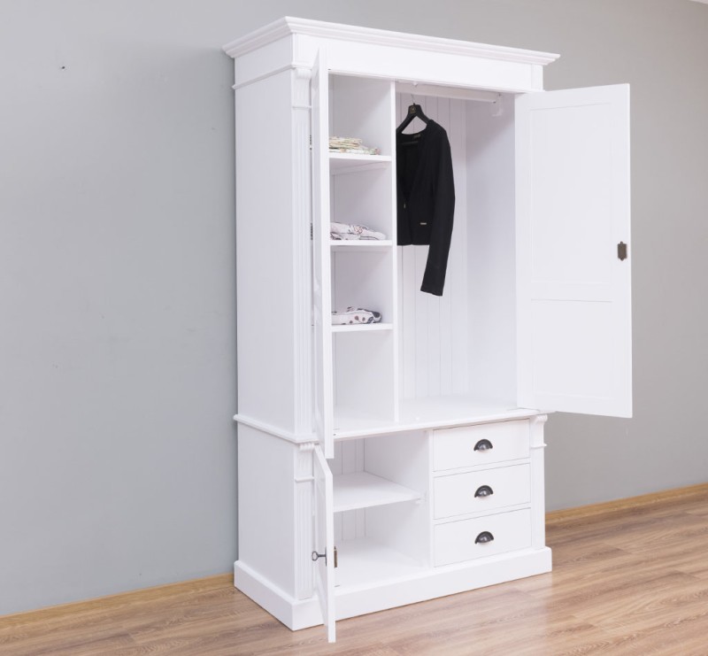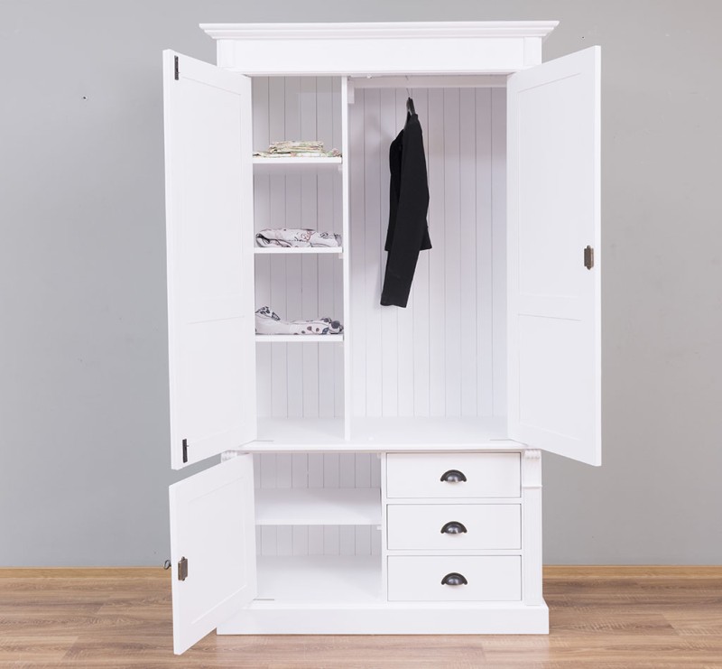 Dieser Kleiderschrank im Landhausstil ist ein hochwertiges, zeitloses Möbelstück, welches in Ihrem Haus einen prägenden Eindruck hinterlässt und eine gute Figur macht. Dieses Möbelstück vereint auf elegante Weise Funktionalität und Ästhetik. Es bietet Stauraum hinter zwei großen Türen und einer kleinen Tür, sowie in den drei Schubladen. Das Design dieses Möbelstücks strahlt zeitlose Eleganz aus und passt sich nahtlos in verschiedene Einrichtungsstile ein. Es ist das perfekte Highlight für diejenigen, die sowohl praktische Lösungen als auch raffinierten Stil suchen.