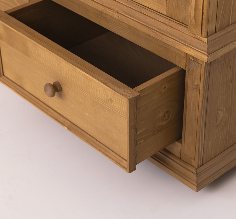 Dieser Kleiderschrank im Landhausstil ist ein hochwertiges, zeitloses Möbelstück, welches in Ihrem Haus einen prägenden Eindruck hinterlässt und eine gute Figur macht. Dieses Möbelstück vereint auf elegante Weise Funktionalität und Ästhetik. Es bietet Stauraum hinter drei großen Türen und zwei kleinen Türen, sowie in den drei Schubladen. Wie auf den Beispielbildern, können Auszüge mit Metallschienen oder Soft Close gegen Aufpreis geliefert werden. Das Design dieses Möbelstücks strahlt zeitlose Eleganz aus und passt sich nahtlos in verschiedene Einrichtungsstile ein. Es ist das perfekte Highlight für diejenigen, die sowohl praktische Lösungen als auch raffinierten Stil suchen. Der Schrank wird montiert in zwei Kartons geliefert, so das der obere Teil des Schrankes nur noch auf den unteren gestellt wird und mit Schrauben befestigt werden muss. Die Abmessungen ca. Höhe 210 cm/ Breite 176 cm/ Tiefe 59 cm 6 feste Regalböden 3 Schubladen 1 Kleiderstange Landhausstil montiert in 2-Teilen 100 % massives Kiefernholz