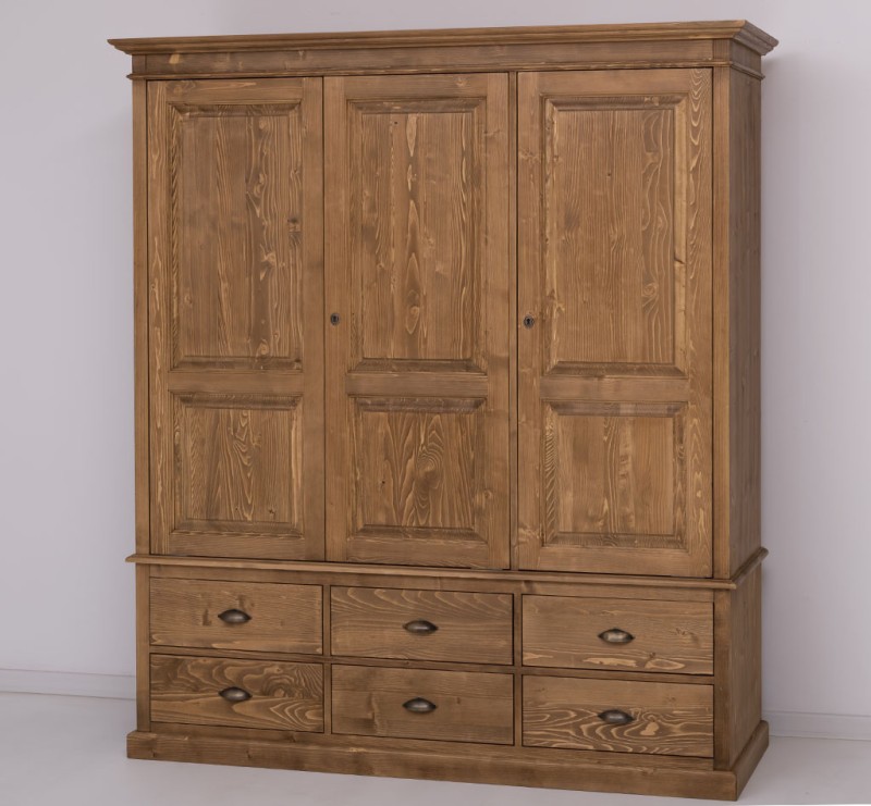 Dieser Kleiderschrank im Landhausstil ist ein hochwertiges, zeitloses Möbelstück, welches in Ihrem Haus einen prägenden Eindruck hinterlässt und eine gute Figur macht. Dieses Möbelstück vereint auf elegante Weise Funktionalität und Ästhetik. Es bietet viel Stauraum hinter drei großen Türen. Das Design dieses Möbelstücks strahlt zeitlose Eleganz aus und passt sich nahtlos in verschiedene Einrichtungsstile ein. Es ist das perfekte Highlight für diejenigen, die sowohl praktische Lösungen als auch raffinierten Stil suchen. Die Abmessungen ca. Höhe 210 cm/ Breite 212 cm/ Tiefe 67 cm feste Regalböden 1 Kleiderstange Landhausstil zerlegt in 4 Paketen 100 % massives Kiefernholz