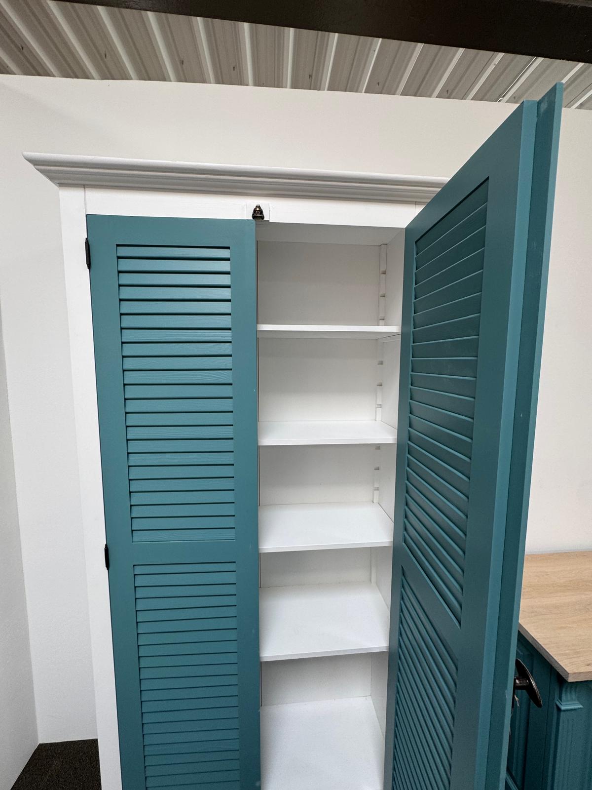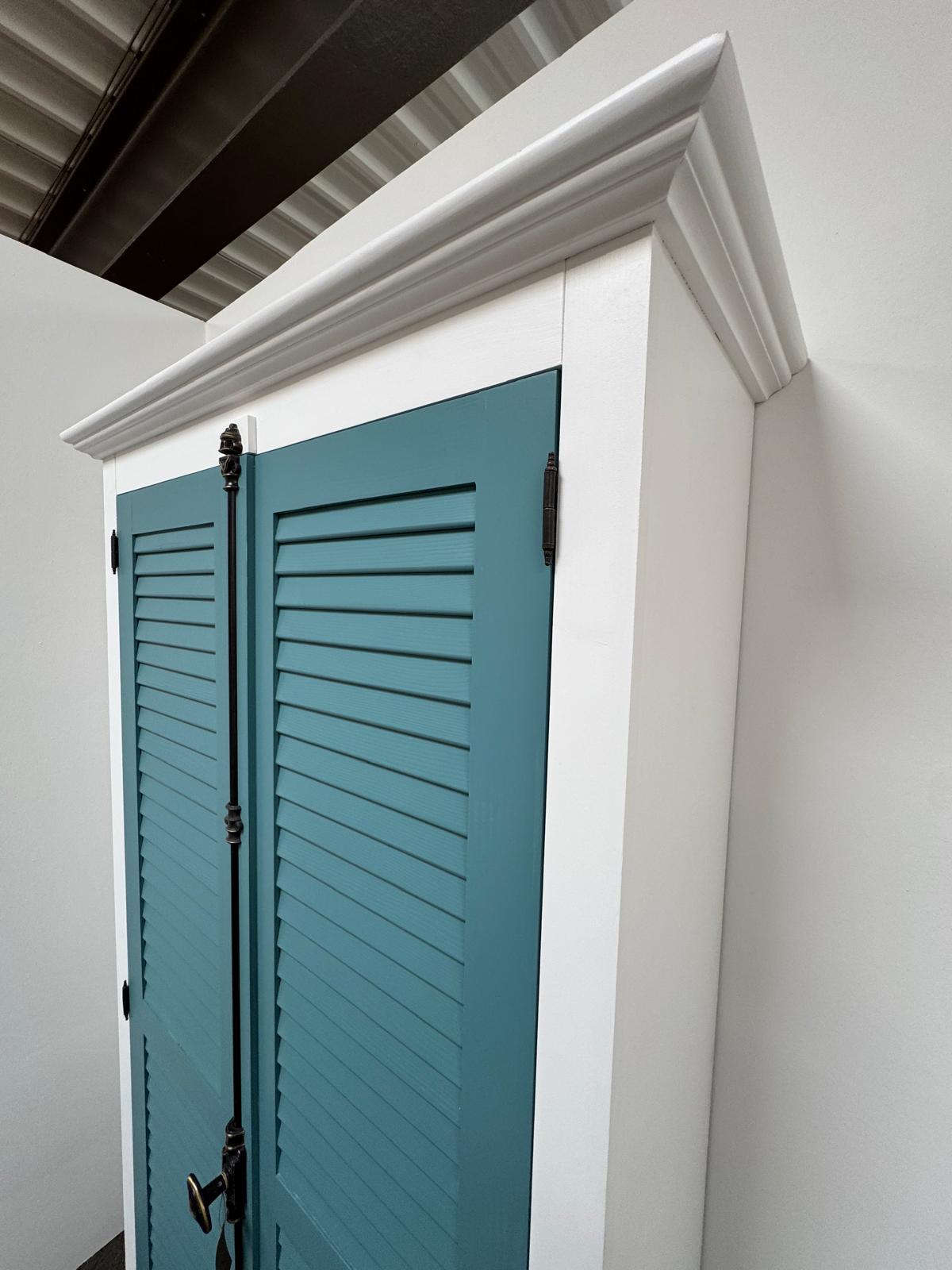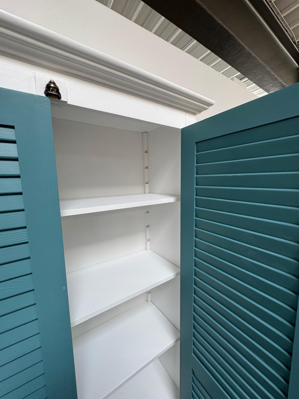 Hinter den zwei großen Lamellentüren befindet sich großzügiger Stauraum. Die verstellbaren Einlegeböden ermöglichen eine individuelle Anpassung an Ihre Bedürfnisse, sodass Kleidung, Accessoires und persönliche Gegenstände optimal organisiert werden können.