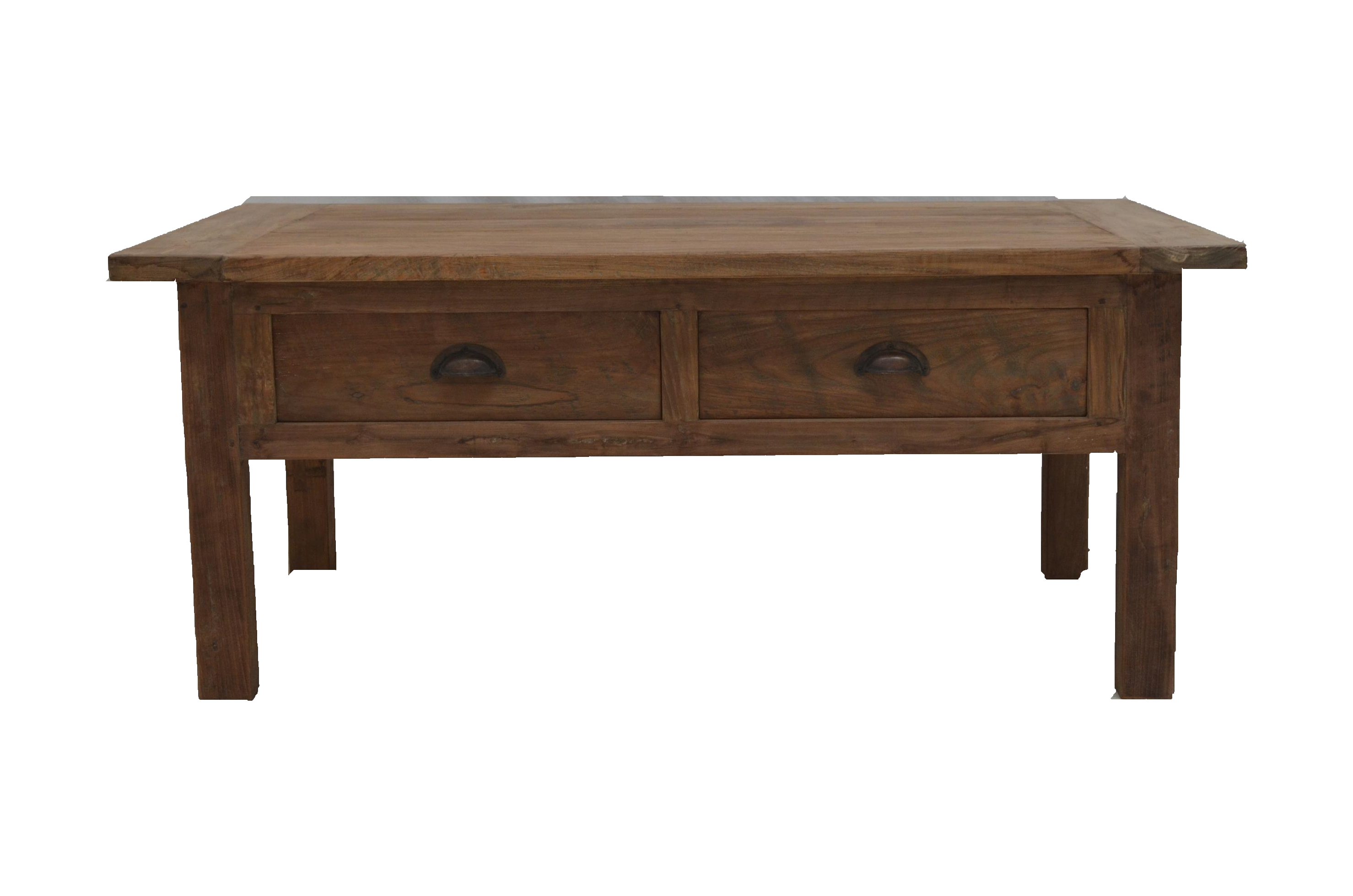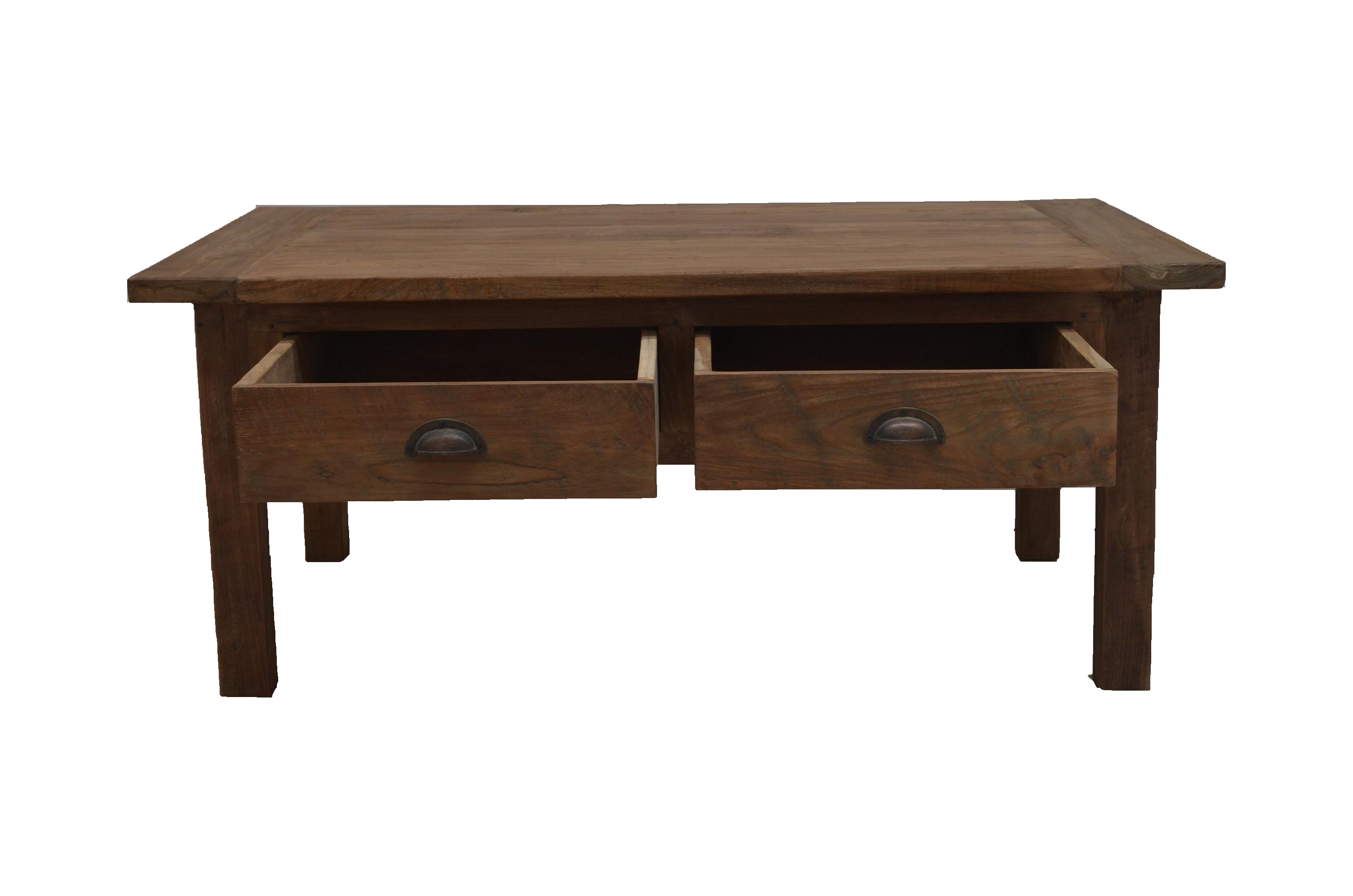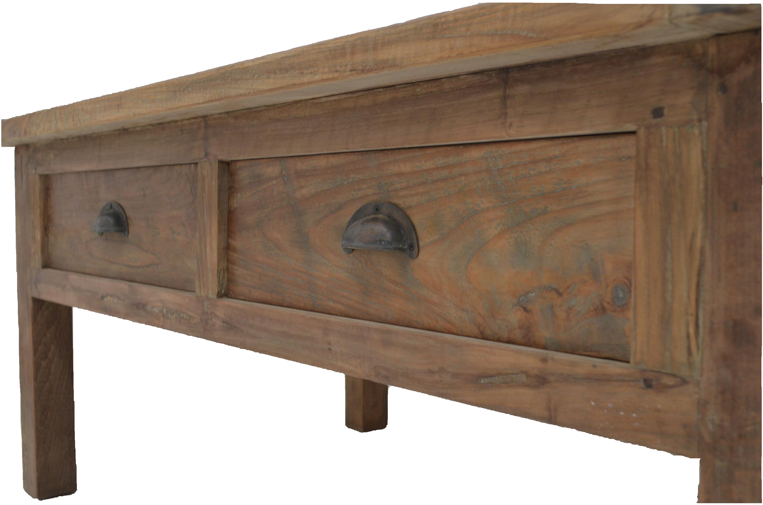 Ein schöner Couchtisch aus recyceltem Teakholz. Der Couchtisch besteht aus altem Teakholz. Mit zwei Schubladen unter der massiven Tischplatte. Durch die einzigartige Maserung ist jedes Möbelstück ein Unikat. Dieses Möbelstück wird nicht nur Ihr Eigenheim in neuem Glanz erstrahlen lassen, sondern Sie durch seine Langlebigkeit auf Dauer erfreuen.