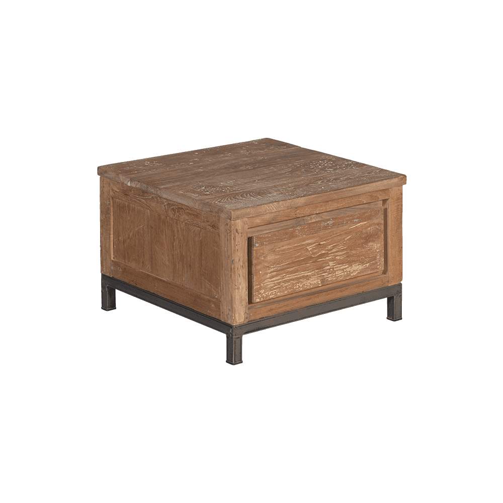 Dieser industrieller Beistelltisch aus der Serie Venedig enthält eine Tischplatte aus Recyceltem Teakholz. Die Basis ist aus Metall. Durch diese Materialkombination passt dieser Couchtisch gut in jedes industrielle Interieur.