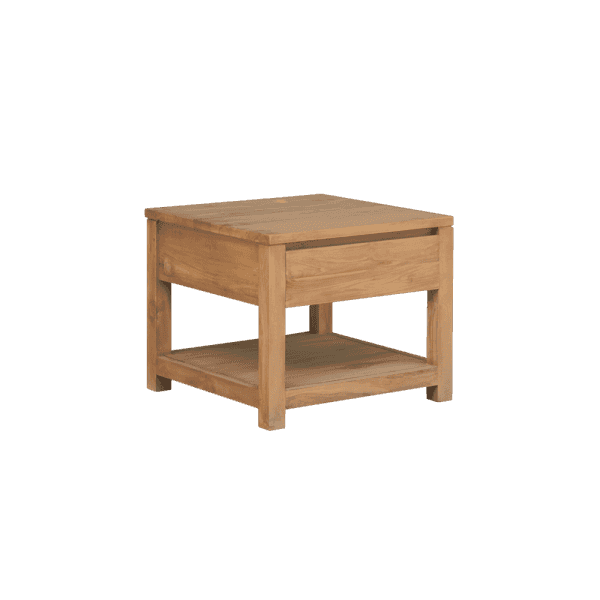 Der quadratische Beistelltisch aus der Serie Losari wurde auf traditionelle Weise, aus unbearbeitetem Teakholz hergestellt. Das gealterte Holz verleiht diesem Beistelltisch seinen Charme in romantisch-ländlicher Atmosphäre.Die schönen klaren Linien und natürlichen Materialien machen dieses Möbelstück für jedes Interieur geeignet! Dieser Beistelltisch hat eine grifflose Schublade.