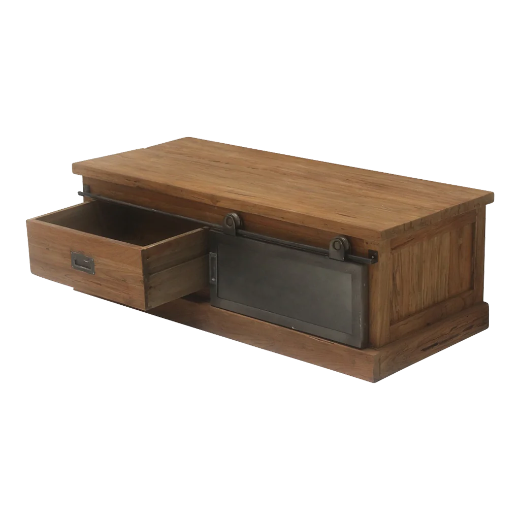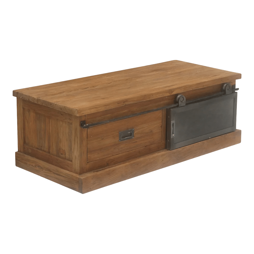 Der Couchtisch Roda wurde aus recyceltem Teak gebaut und hat sechs Schubladen und eine Schiebetür, welche auf einer Metallschiene aufgehängt ist. Die massiven Teakmöbel sind sehr belastbar und leicht zu reinigen und zu pflegen. Zeitlos attraktiv präsentiert sich ein Teakmöbel auch noch nach Jahren. Jedes Modell ist ein Unikat. Dieses Möbelstück wurde von traditionellen Handwerkern noch handgefertigt. Ein schöner naturbelassener Beistelltisch. Dieses Möbelstück wird nicht nur Ihr Eigenheim in neuem Glanz erstrahlen lassen, sondern auch Sie durch seine Langlebigkeit und den Anblick auf Dauer erfreuen.