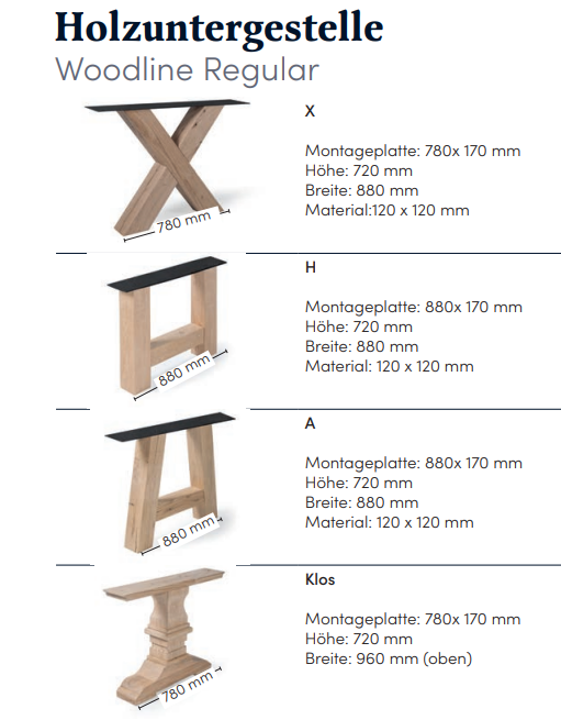 Die Wohnpalast Holzgestelle aus der Serie Regular bieten verschiedene Modelle an. Die Gestelle wurden aus Holz (Eiche) gefertigt und sind ggf. mit einer Montageplatte aus Metall ausgestattet. Die Farbe ist Natur, unbehandelt. Wählen Sie das passendes Gestell für Ihre Tischplatte aus.