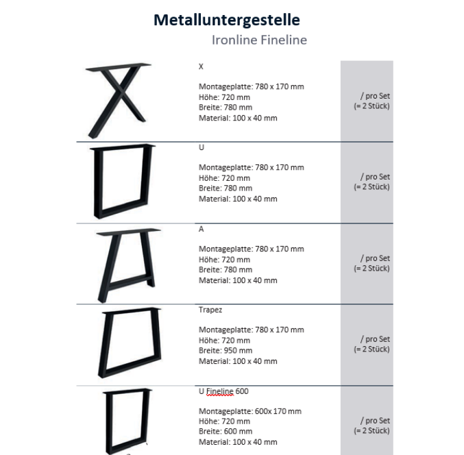 Die Wohnpalast Metallgestelle aus der Serie Fineline bieten verschiedene Modelle an. Die Gestelle sind aus Eisen gefertigt, pulverbeschichtet und sind mit einer Montageplatte aus Metall ausgestattet. Wählen Sie das passendes Gestell für Ihre Tischplatte aus.