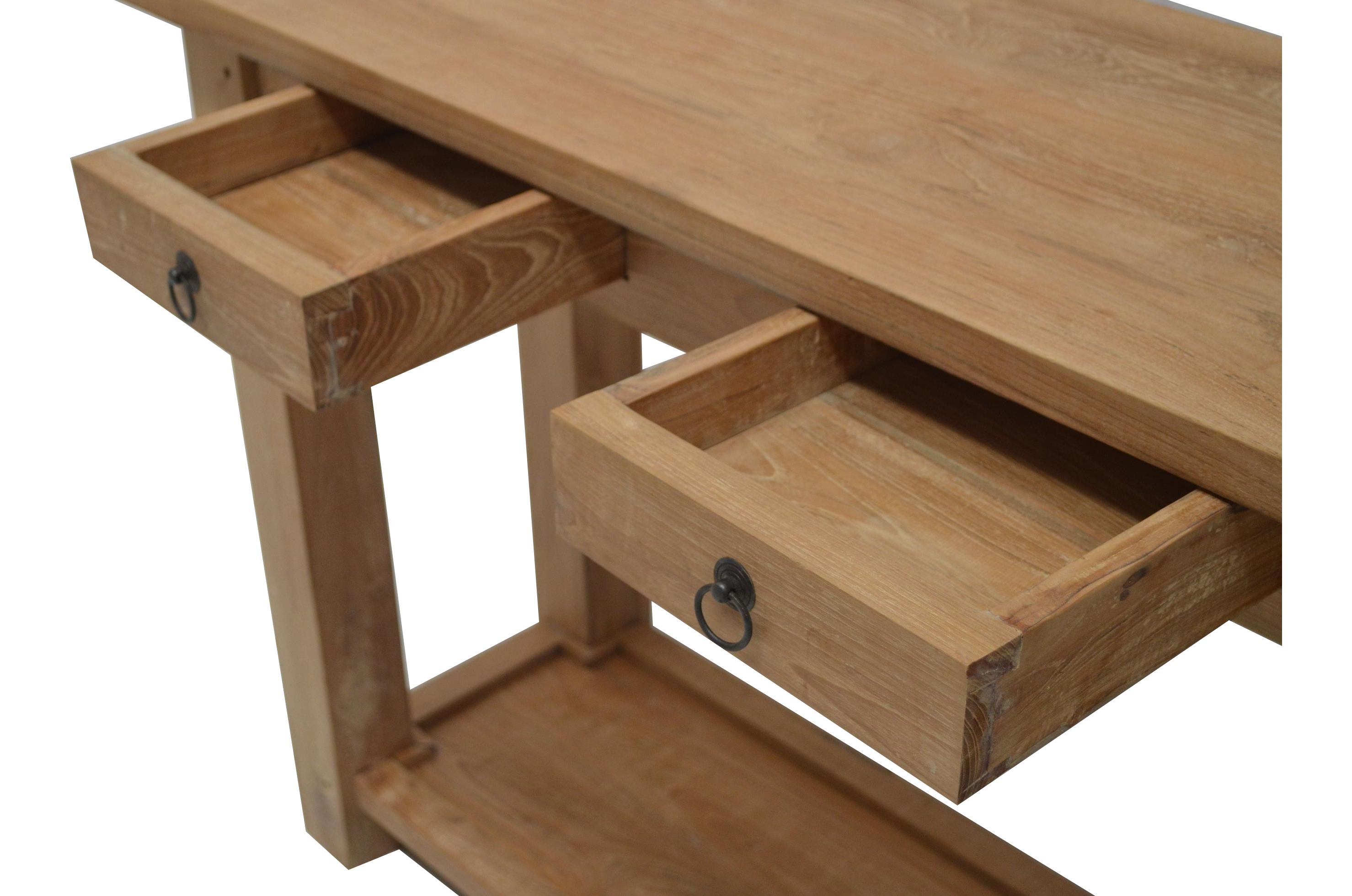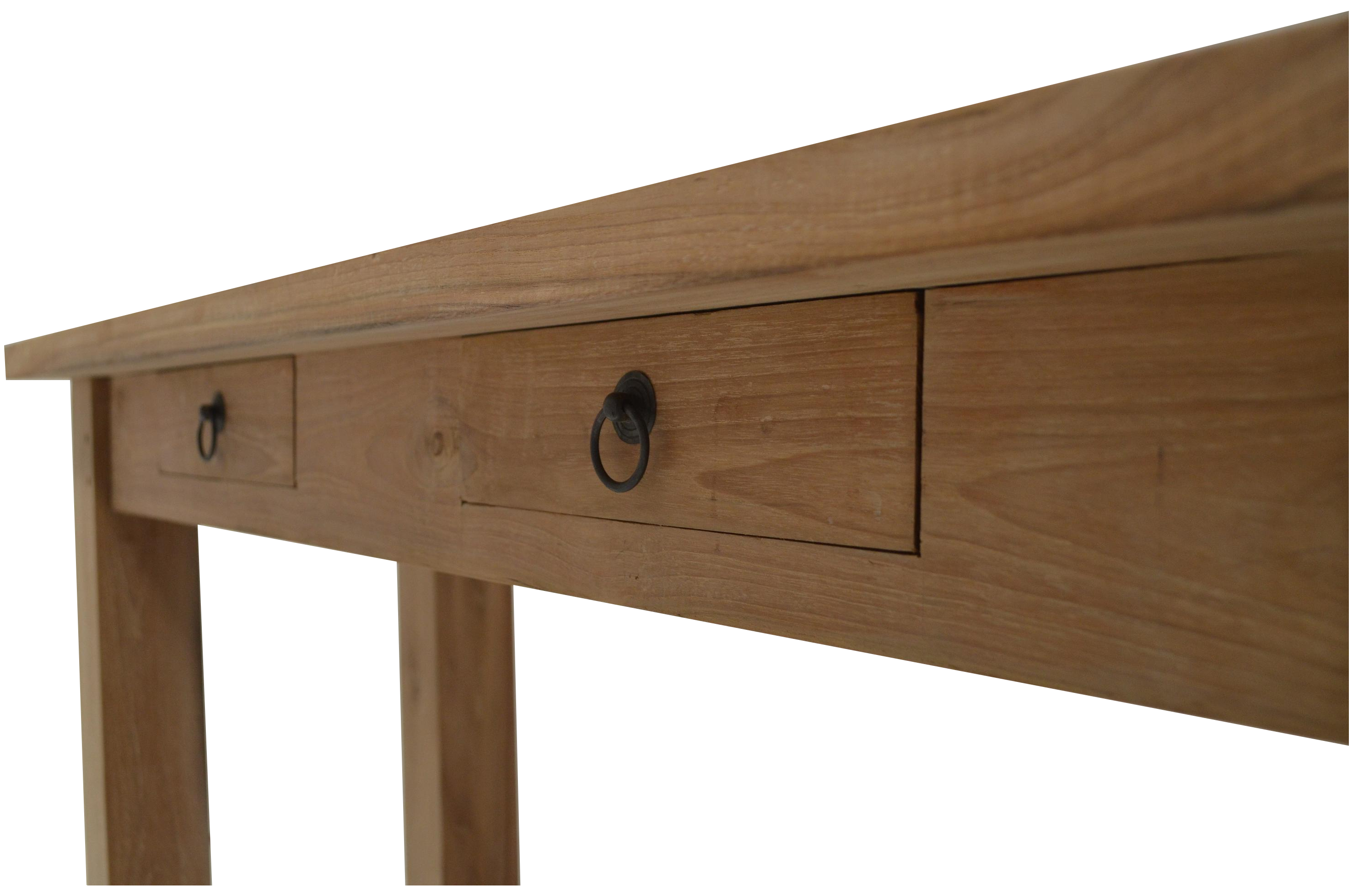 Mit massiven Blockbeinen und zwei großen Schubladen. Die Tischplatte hat einen leichten Überstand. Das Teakholz ist recycelt und rustikal naturbelassen. Die Konsole ist vielseitig nutzbar, überall wo Sie gebraucht wird. Als Konsolentisch im Flur, als Wandtisch im Schlafzimmer oder als ein dekoratives Sideboard im Wohnzimmer.