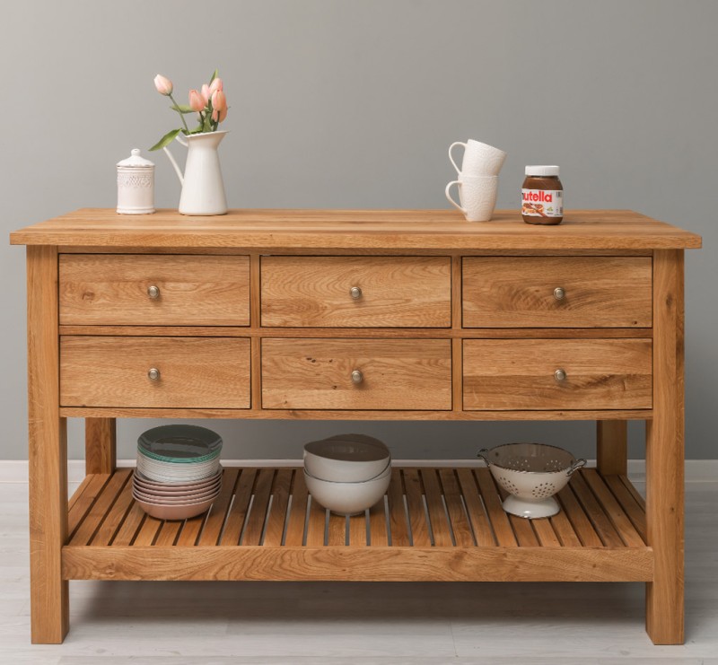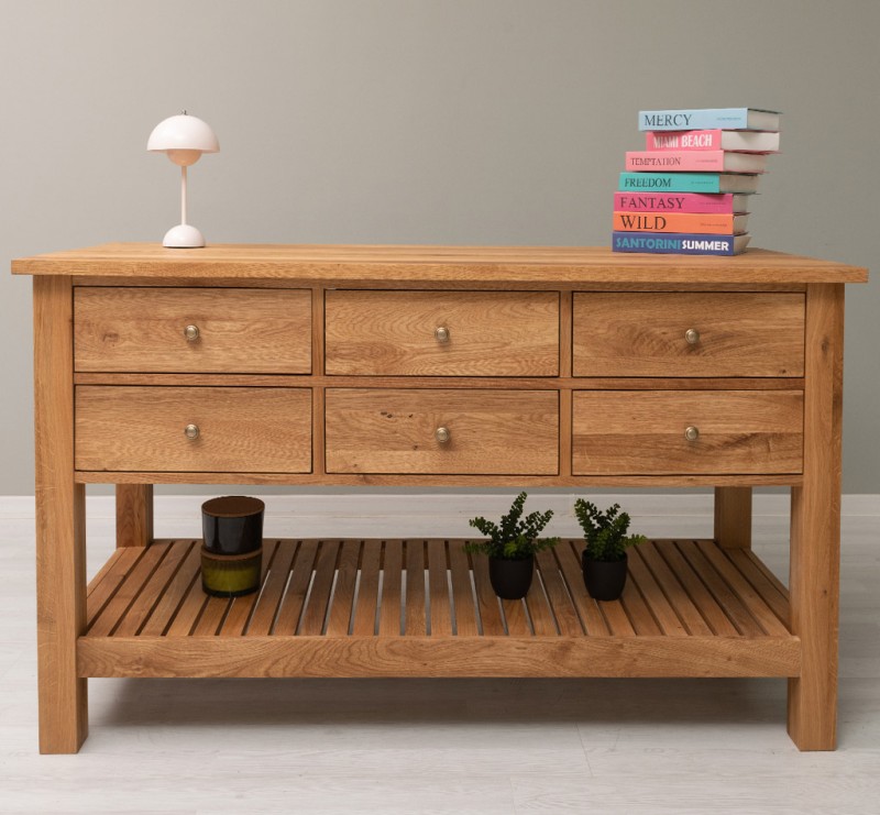 Mit sechs Schubladen bietet der Tisch großzügigen Stauraum für alltägliche Dinge, während das untere Ablagebrett zusätzlichen Platz für Körbe, Bücher oder Dekoration schafft. Ob im Flur als Konsolentisch, im Schlafzimmer als stilvoller Wandtisch oder als charmantes Sideboard im Wohnzimmer – dieses Möbelstück fügt sich harmonisch in jedes Ambiente ein.