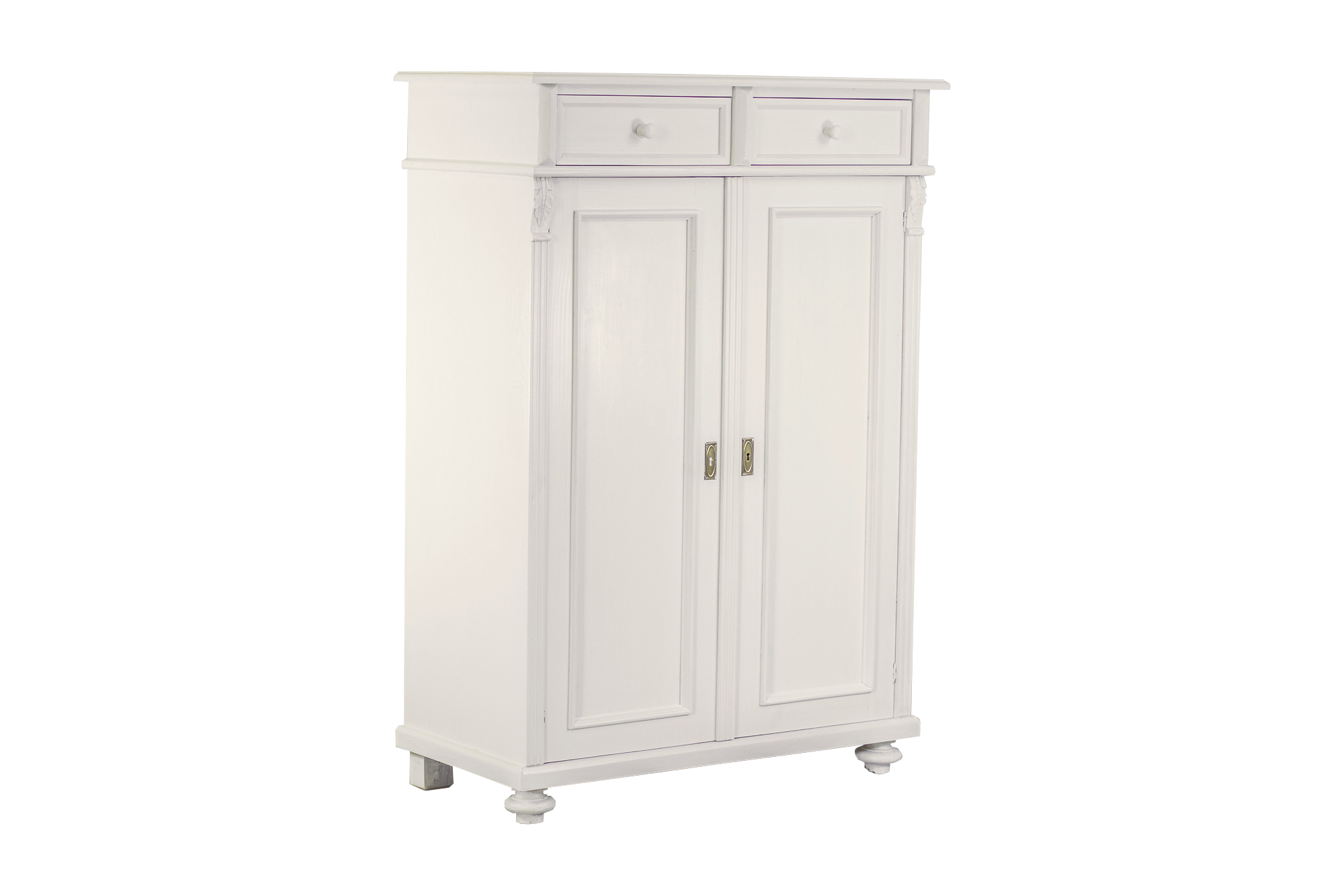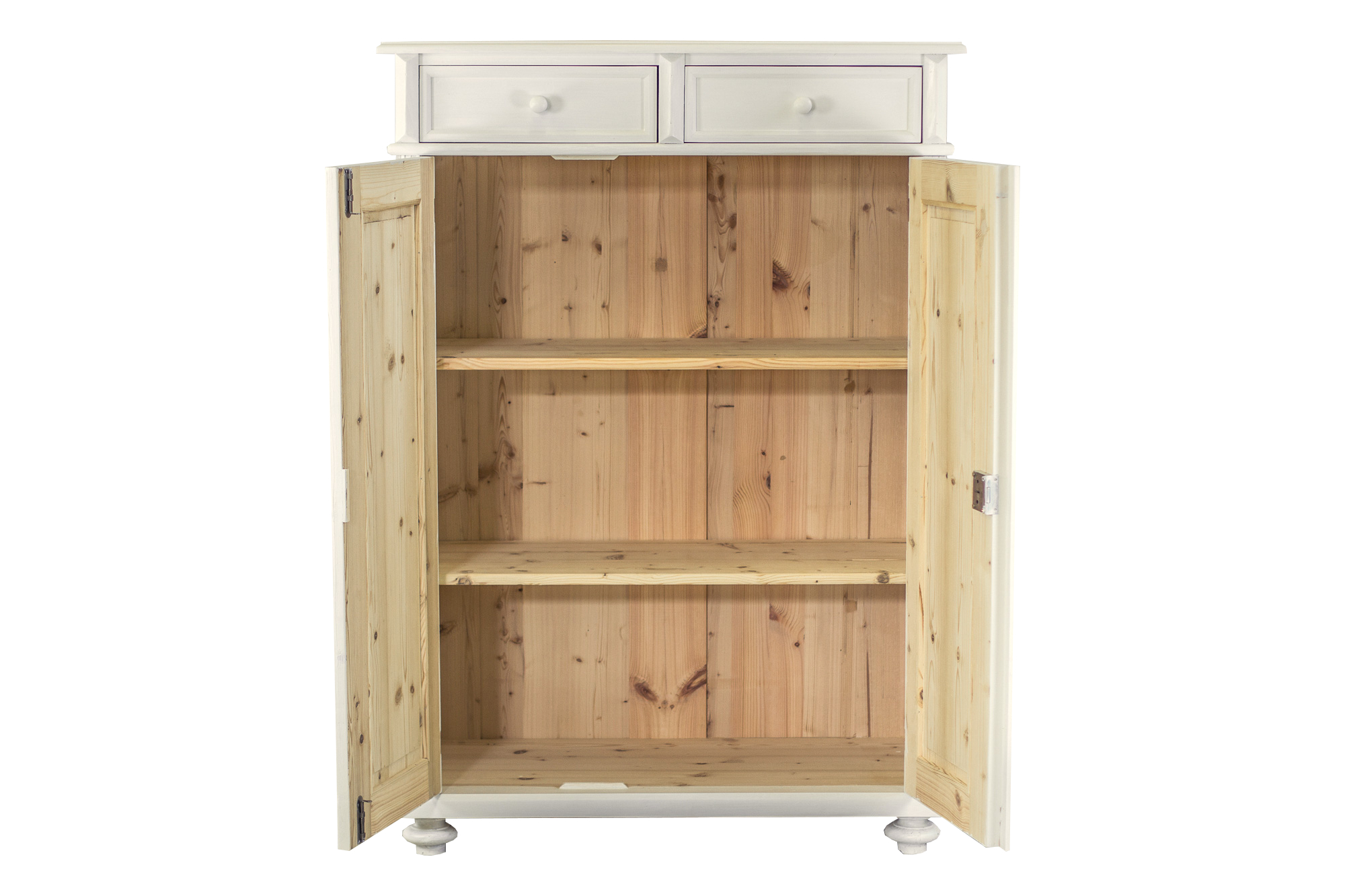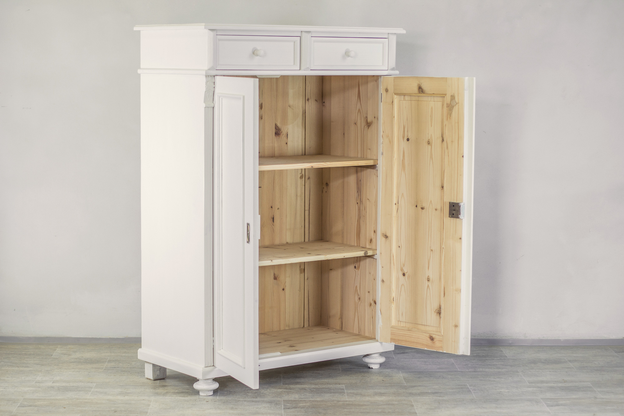 Ein schönes Weichholz Vertiko mit zwei großen Türen und Schubladen. Der Innenausbau beinhaltet stabile Regalböden. Die vorhandenen Gebrauchsspuren haben einen antiken Charakter und sind bewusst gewollt. Der Korpus ist ein einem schönen altweiß gehalten. Dieses Vertiko im angesagten Landhausstil ist ein hochwertiges und zeitloses Möbelstück, welches überall in Ihrem Haus einen prägenden Eindruck hinterlässt und eine gute Figur macht.