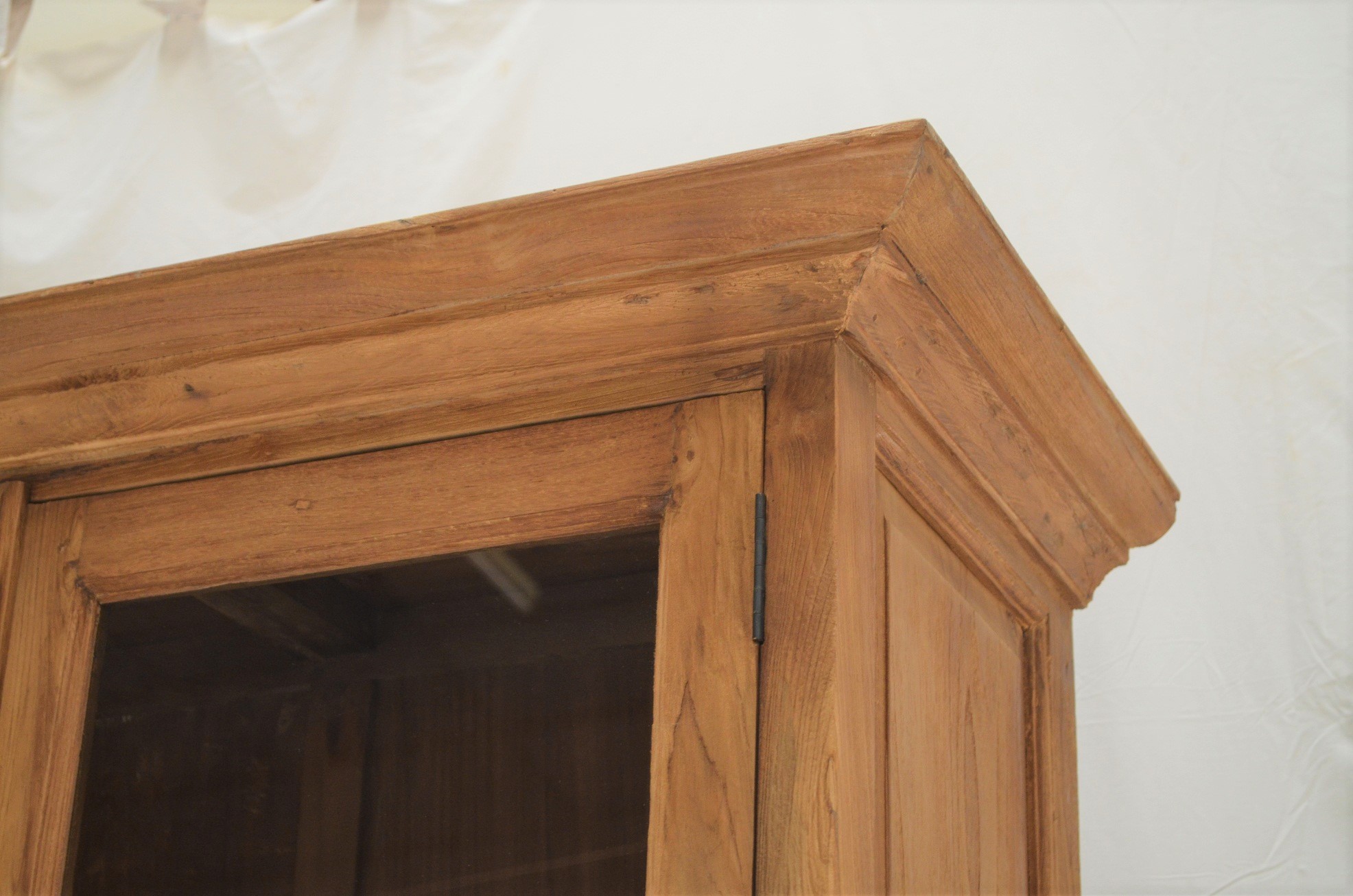 Der große Vitrinenschrank wurde aus recyceltem Teak gebaut und hat dadurch einen ganz eigenen Charme. Die massiven Teakmöbel sind sehr belastbar und leicht zu reinigen und zu pflegen. Zeitlos attraktiv präsentiert sich ein Teakmöbel auch noch nach Jahren. Jedes Modell ist ein Unikat. Dieses Möbelstück wurde von traditionellen Handwerkern noch handgefertigt. Ein schöner naturbelassener Vitrinen Schrank. Dieses Möbelstück wird nicht nur Ihr Eigenheim in neuem Glanz erstrahlen lassen, sondern auch Sie durch seine Langlebigkeit und den Anblick auf Dauer erfreuen.