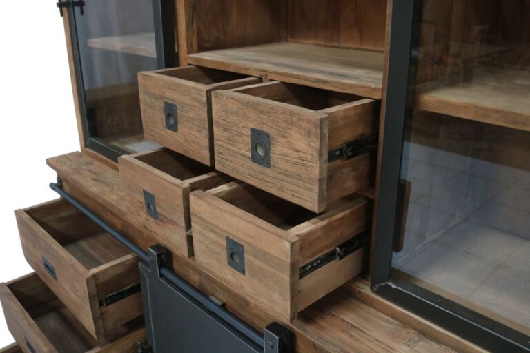Unterer Schrank: Zwei offene Fächer in der Mitte, flankiert von drei Schubladen auf Eisenschienen links und rechts – abgedeckt durch Eisentüren für einen harmonischen Industrie-Look.